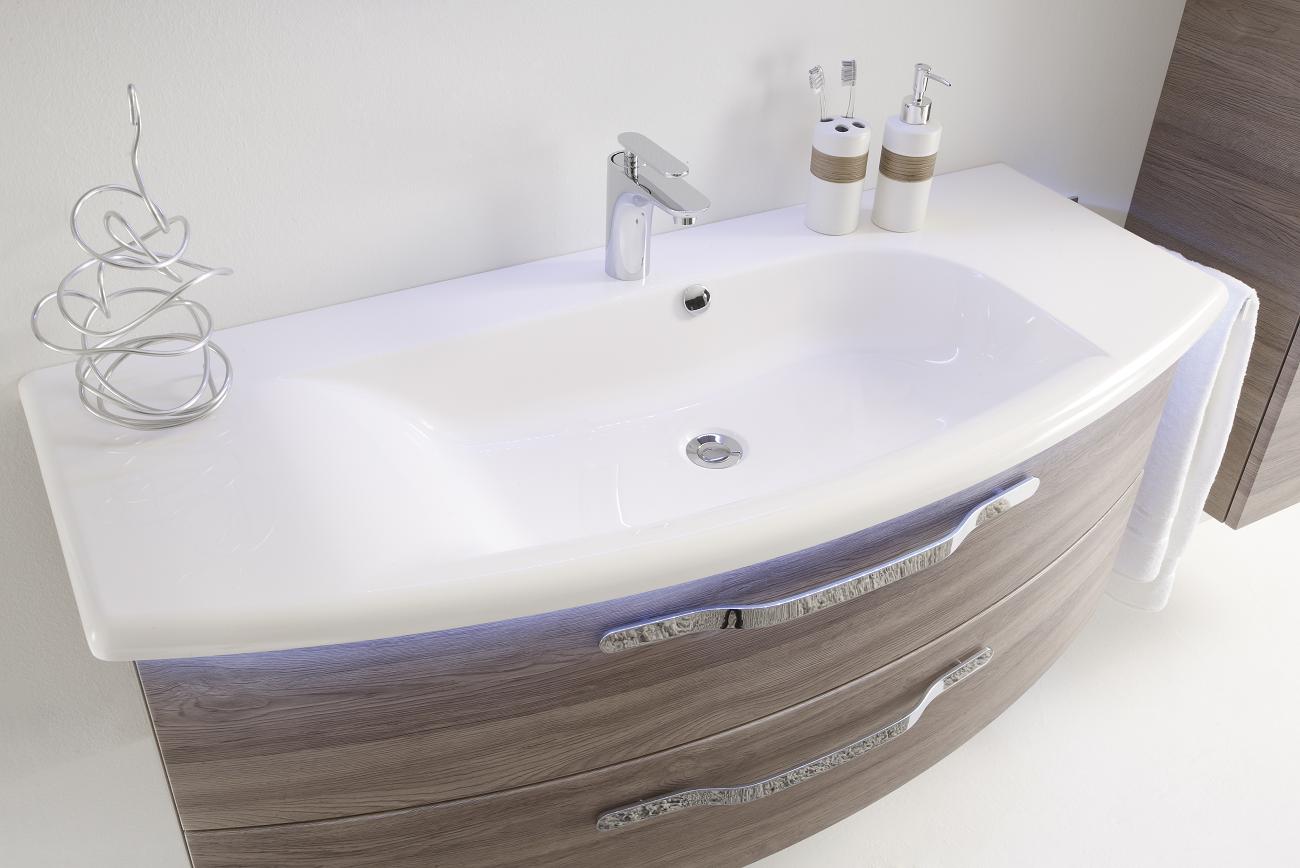 Ein besonderes Waschtischset aus dem Hause Pelipal. Der Waschplatz Pelipal 7005 setzt sich aus einem 124 cm breiten Mineralmarmor-Waschbecken und einem 119 cm breiten Waschtischunterschrank, wahlweise mit oder ohne Beleuchtung zusammen.