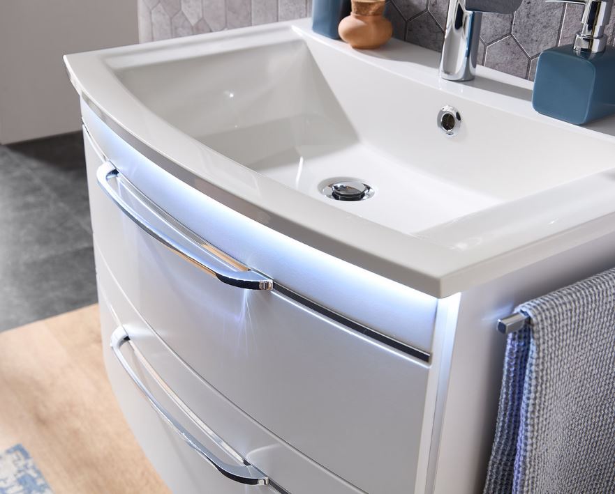 Front und Korpus können, je nach persönlichem Geschmack, in moderner Lackfarbe oder Holzdekoren ausgewählt werden. Jede Frontfarbe können Sie optional mit chromfarbener oder schwarzer Einlage bestellen. Passend zur Einlage fällt der Griff in Chrom Glanz oder Schwarz matt aus. Sie haben hier die Wahl zwischen 4 schönen Farbtönen. Eine Farbe davon liegt in der Preisgruppe 2 - die Halifax Eiche Synchronpore. Eine wunderschöne Variante mit "nature feeling"! Für ein besonders stimmungsvolles Ambiente besteht die Möglichkeit für die Schattenfuge zwischen Waschtisch und Waschtischunterschrank auch eine LED-Beleuchtung inklusive Bewegungssensor mit zu bestellen.