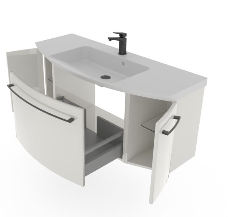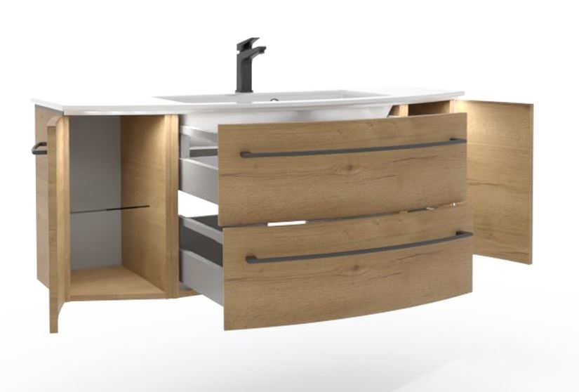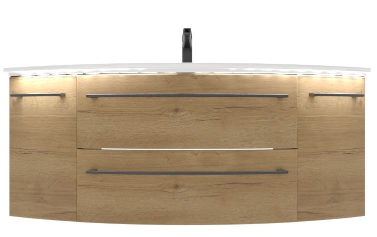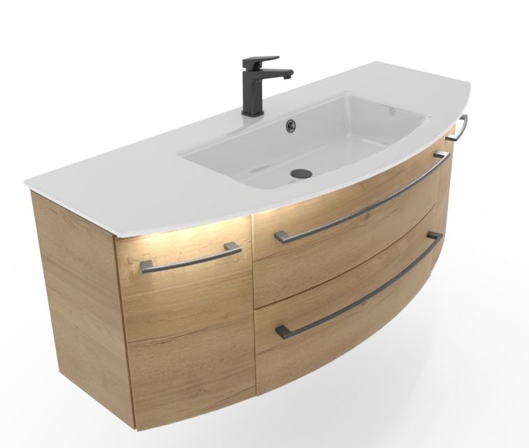 Auch für den Waschtischunterschrank gibt es Auswahlmöglichkeiten. Entweder mit einem großen Schubkasten oder zwei Kleinere und zwei Drehtüren, entweder mit Beleuchtung oder ohne Unterbodenbeleuchtung.