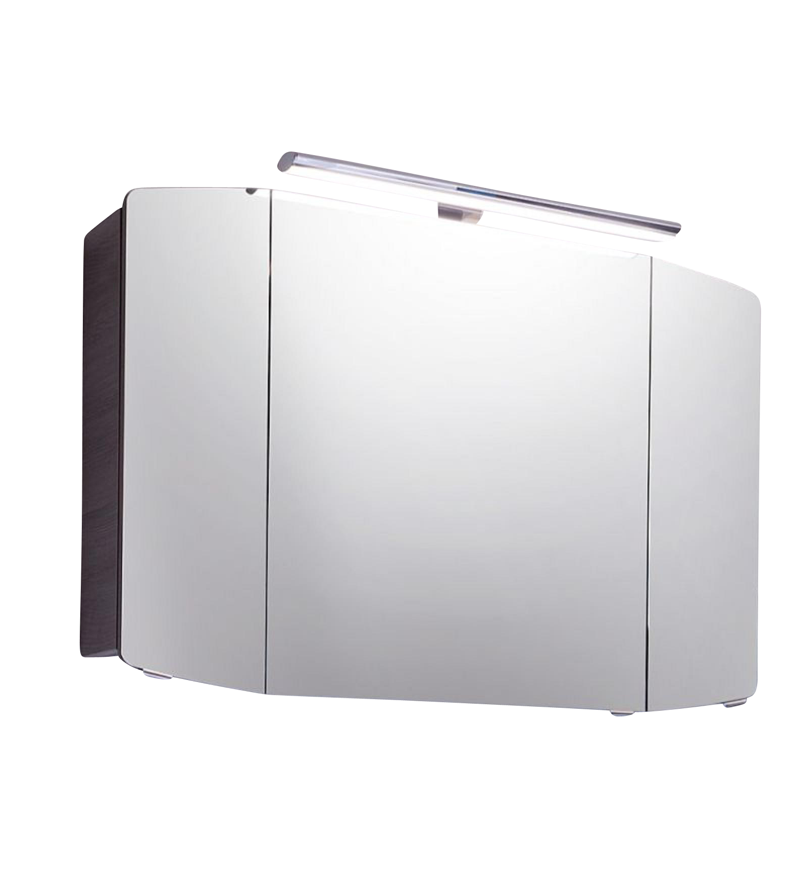 Die Besonderheit dieses Spiegelschrankes sind die abgeschrägten Außen-Spiegeltüren, sowie die Auswahl der Position des Schalter-Steckdosen-Modules. Dieses können Sie wählen ob innenliegend hinter der rechten Spiegeltüre, außen links am Korpus, außen rechts am Korpus oder unten am Korpus angebracht ist.