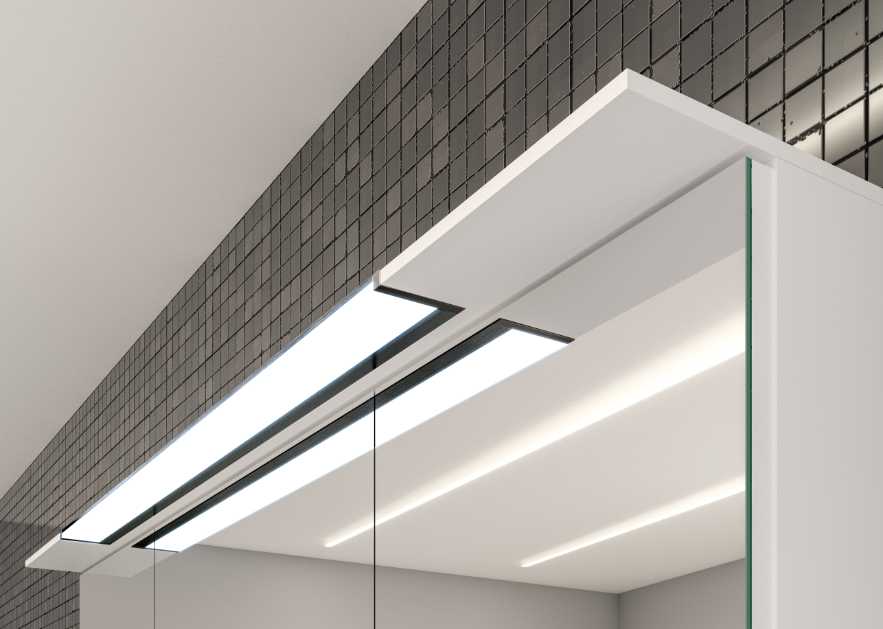 Im Kranzboden eingearbeitet ist eine hochwertige 6W LED-Beleuchtung. Durch diese werden die großen Spiegelflächen perfekt in Szene gesetzt und Ihr Badezimmer in ein warmes Licht getaucht.
