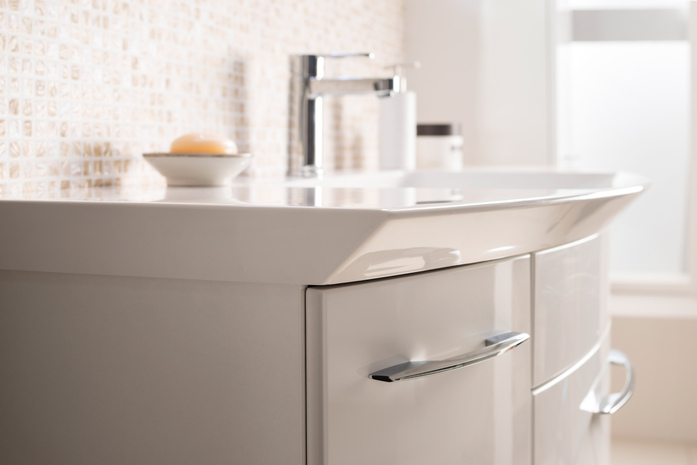 Die Griffe aus dem Badezimmerprogramm Pelipal Cassca sind in Chrom glänzend gehalten und immer serienmäßig dabei.