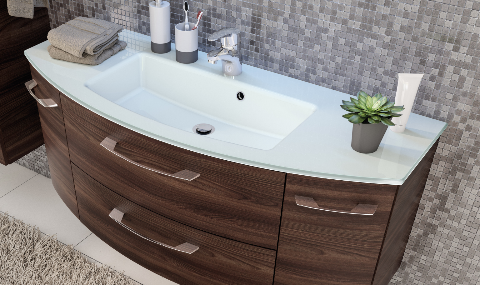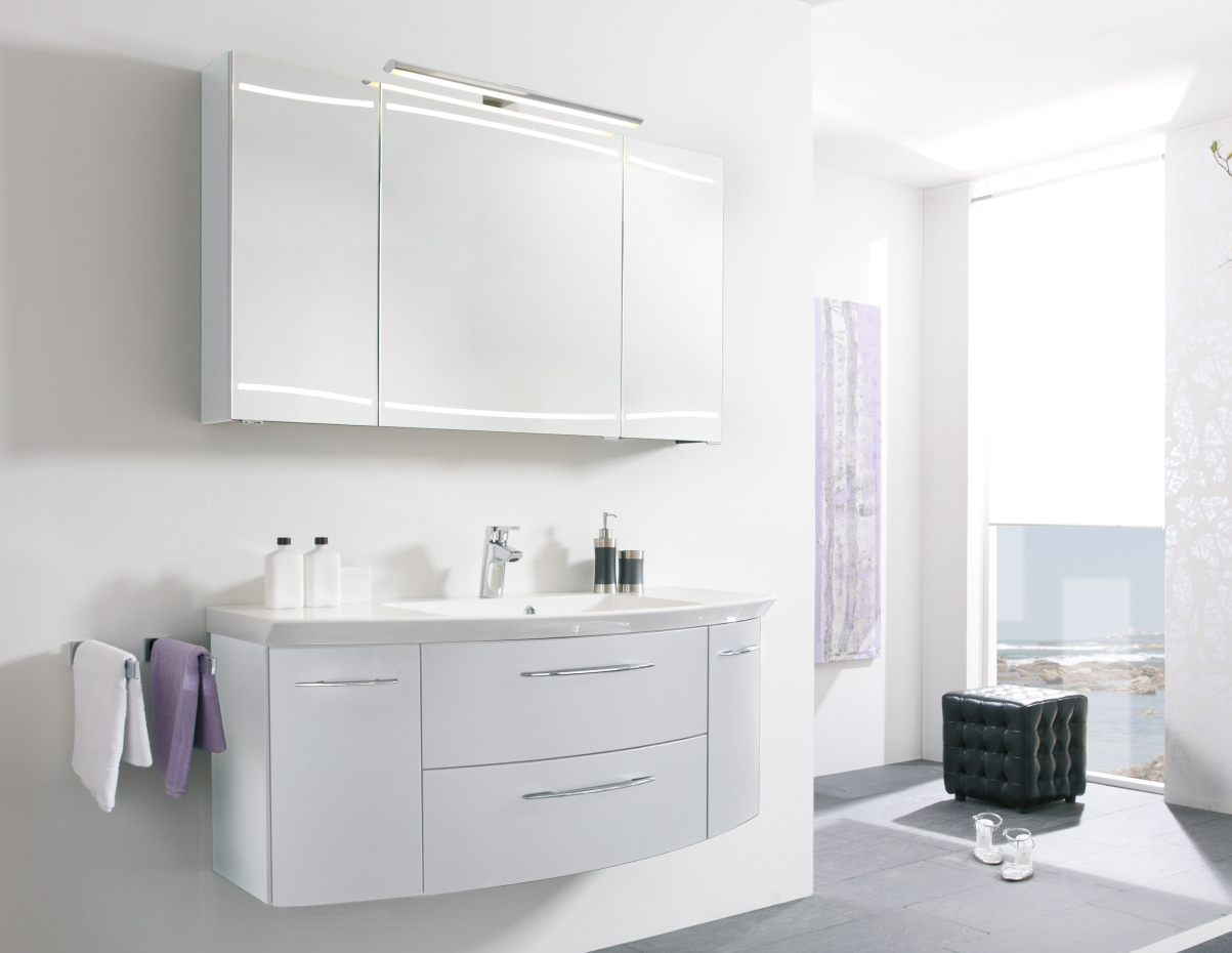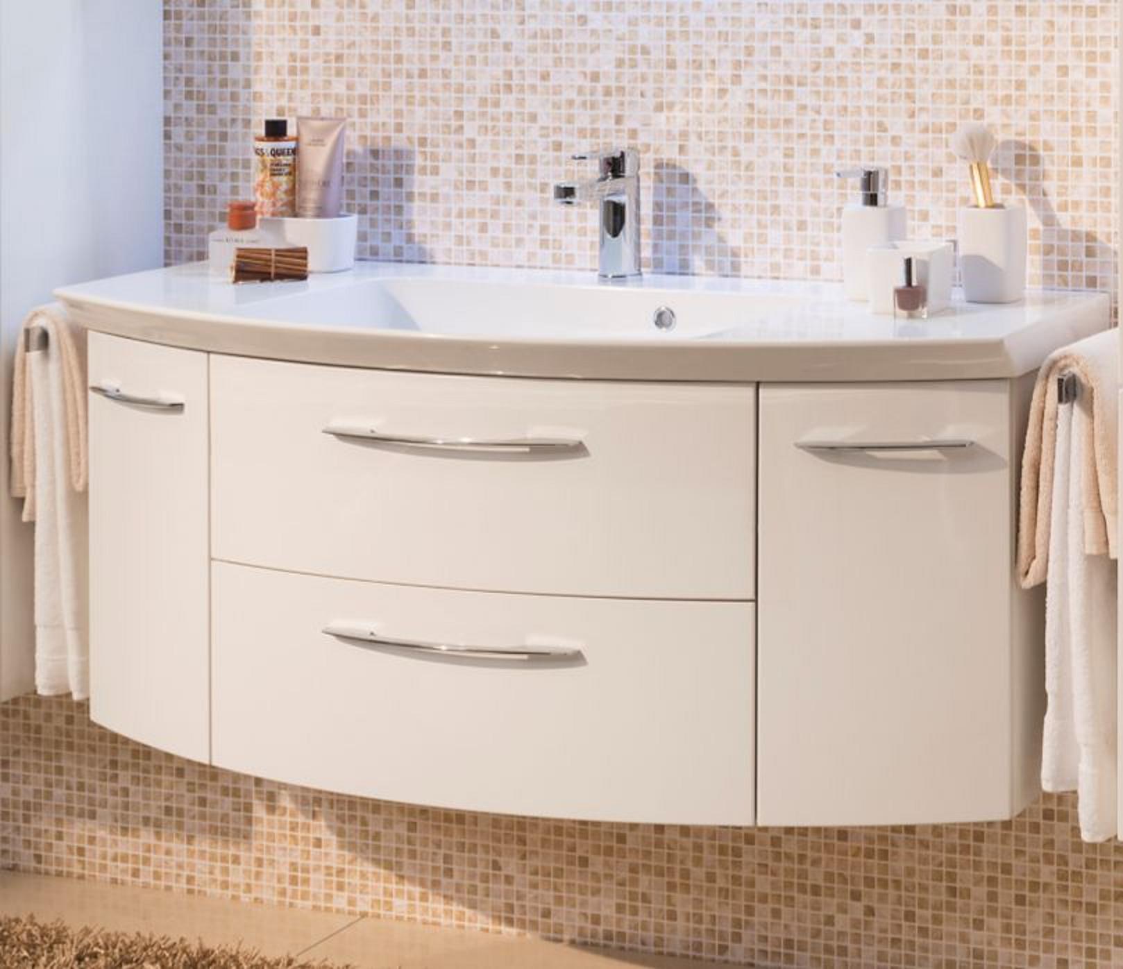 1. Pelipal Cassca Badmöbel Waschtisch in einzigartiger Form. Das leicht nach vorne gerundete Becken können Sie in einem hochwertigen Mineralmarmor oder einem eleganten Glas wählen. Mittig das Becken und links und rechts davon jeweils eine praktische Ablage