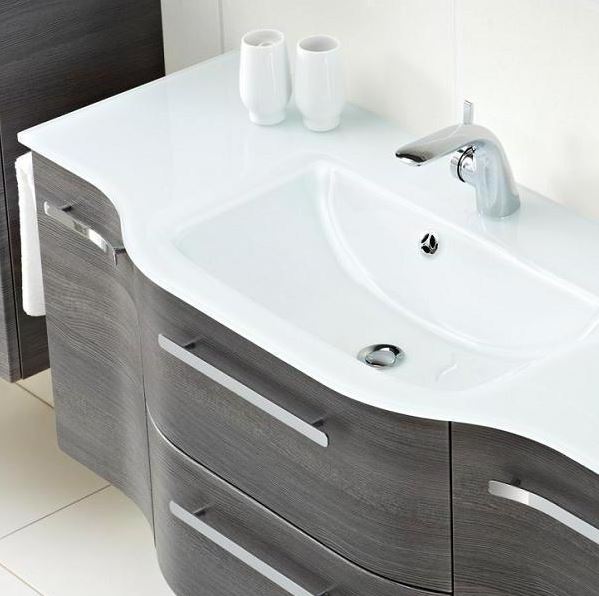Die Pelipal Contea Waschtische in der Breite 119 cm und 120,7 cm sind in einer asymmetrischen Form gestaltet. Das Becken ist auf der rechten und die geräumige Ablagefläche auf der linken Seite angeordnet. Das Set ist in seiner Grundform mit dem Mineralmarmor-Waschtisch BRE006M12001 ausgestattet, kann aber, gegen Aufpreis, auch mit dem Glaswaschtisch CT-GWTR-505-1190-03 bestellt werden.