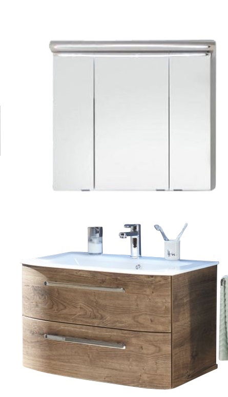 Eine wunderschöne Badkombination aus einem 82 cm breitem Mineralmarmor-Waschtisch, oder wahlweise Glas-Waschtisch, dem passenden Unterschrank mit zwei geräumigen Türen und einem tollen dreitürigen Spiegelschrank inklusive Kranzbeleuchtung.