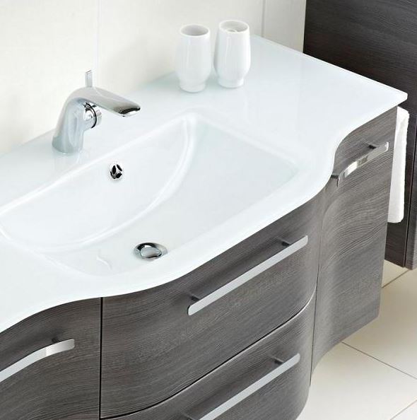 Der Pelipal Contea Waschtisch in der Breite 128 cm ist in einer modernen, leicht nach vorne geschwungenen Form gestaltet. Das Becken ist mittig angeordnet und auf der linken und rechten Seite mit geräumigen Ablagen ausgestattet. Der Waschtisch ist in Mineralmarmor oder Glas erhältlich.