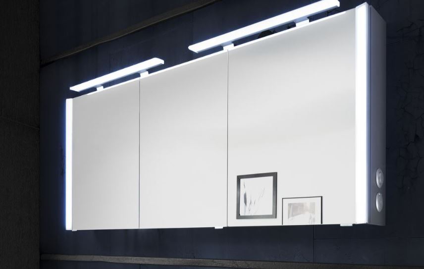 Dieser Spiegelschrank mit eleganter LED-Beleuchtung an den Seiten und mit Aufsatzleuchten wertet Ihr Bad auf!