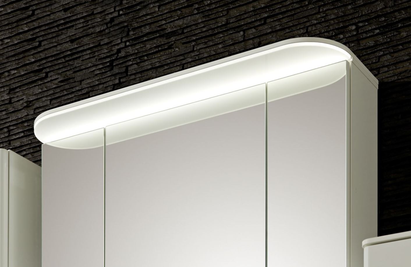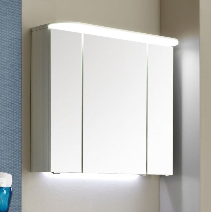 Der Pelipal Pineo Spiegelschrank PN-SPS 06 ist 85 cm breit sowie 74 cm hoch und 17 cm tief. Er ist mit drei einfach verspiegelten Drehtüren, sechs Glaseinlegeböden sowie einem Schalter und einer Steckdose ausgestattet. Schalter und Steckdose befinden sich serienmäßig innen unten hinter der rechten Drehtür. Ganz neu bietet Pelipal jetzt auch die Möglichkeit an, dass Schalter und Steckdose außen montiert sind. Sie können die Position von Schalter und Steckdose wählen zwischen links außen, rechts außen oder unten. Der Innenraum des Spiegelschrankes PN-SPS 06 wird durch die sechs Glaseinlegeböden optimal eingeteilt und bietet Ihnen genügend Raum um Ihre täglichen Pflegeprodukte übersichtlich unterzubringen. Durch die bereits werksseitig im Kranz integrierte stilvolle LED-Beleuchtung hat der Pelipal Pineo Spiegelschrank PN-SPS 06 optimal ausgeleuchtete Spiegelflächen. Für zusätzliche Lichteffekte und noch mehr Licht am Waschplatz, besteht für diesen Spiegelschrank die Möglichkeit optional eine LED-Zusatzbeleuchtung auszuwählen. Die Zusatzbeleuchtung wird unterhalb des Spiegelschrankes untergebracht und beleuchtet den Waschtisch von oben.