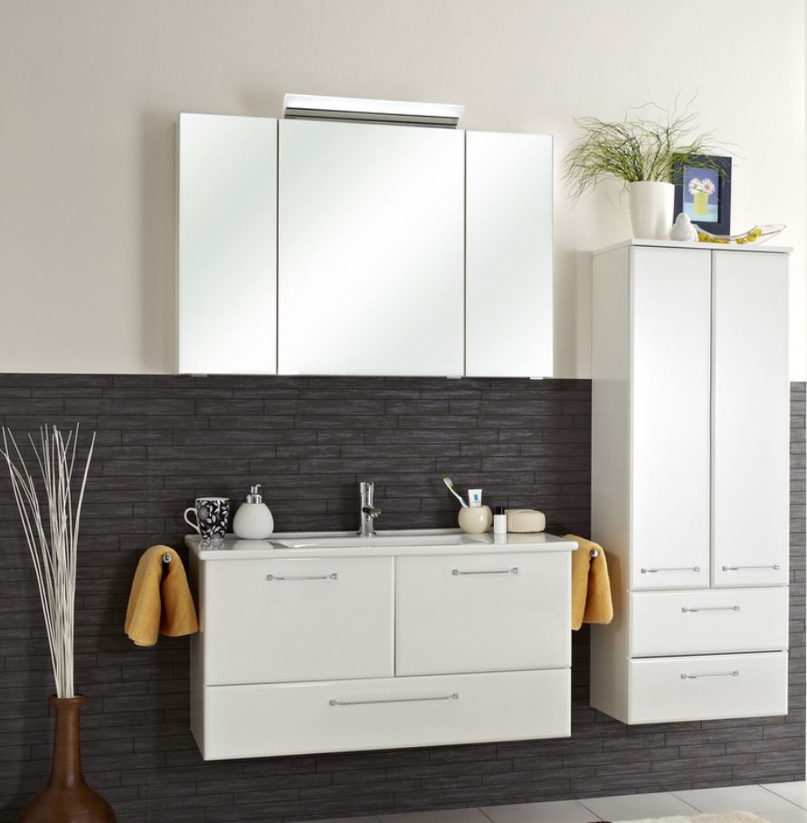 Das Badmöbelset von Pelipal besteht aus einem praktischen wie geräumigen Waschbeckenunterschrank mit 2 Drehtüren und Auszug, einem pflegeleichten Waschtisch sowie einem komfortablen Spiegelschrank. Der Spiegel beinhaltet eine LED-Aufsatzleuchte sowie 3 Spiegeltüren und 6 Glaseinlegeböden. Der Waschtisch steht Ihnen in den Materialien Glas, Mineralmarmor oder Keramik zur Verfügung. Das Set hat eine Breite von 100 cm. Das Modell Pelipal 341 hält Möbelstücke in Weiß Glanz für Sie bereit. Die Modelle werden mit einem Bügelgriff in Chrom Glanz geliefert. Ihr Badmöbelset können Sie mit tollen und praktischen Beimöbeln dieser Serie optimal ergänzen. Es gibt funktionelle Hochschränke, Midischränke, Highboard und Wandschrank. Diese praktischen Schränke bringen viel Stauraum und Ordnung in Ihr gut sortiertes Badezimmer.