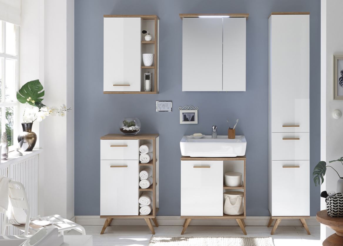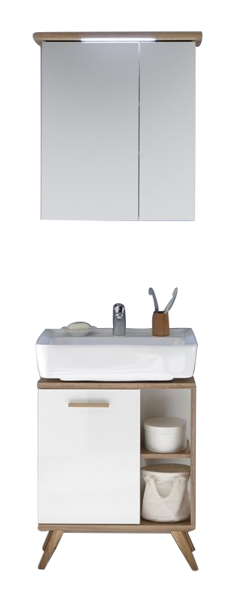 Das Badmöbelset von Pelipal 923 besteht aus einem praktischen wie geräumigen Waschbeckenunterschrank mit Siphonausschnitt, 2 Drehtüren und seitlichen Ablagefächern sowie aus einem Spiegelschrank inklusive Beleuchtung, Schalter und Steckdose. Der Unterschrank wird stehend auf Füßen in Holzoptik montiert und ist universal einsetzbar. Wahlweise erhalten Sie anstelle des Spiegelschrankes auch einen modernen Flächenspiegel. Das Set hat eine Breite von 60 cm und ist hierdurch ideal für ein komfortables Gästebad oder WC geeignet. Das Modell Pelipal 923 präsentiert sich skandinavisch angehaucht. Eine schöne warme Kombination aus Weiß Glanz mit Holzelementen in Riviera Eiche Nachbildung sorgen für ein stilvolles Ambiente. Die Holzgriffe heben sich von der weißen Front in Glanz wunderbar ab und bilden einen tollen Kontrast. Auch die Füße in Holzoptik ergänzen das Design einwandfrei. Das Modell 923 hält zudem tolle und praktische Beimöbel wie Hochschrank, Midischrank, Unterschrank und Wandschrank für Sie bereit. Diese funktionalen Schränke bringen viel Stauraum und Ordnung in Ihr gut sortiertes Badezimmer. Die Beimöbel werden stehend auf Füßen montiert.