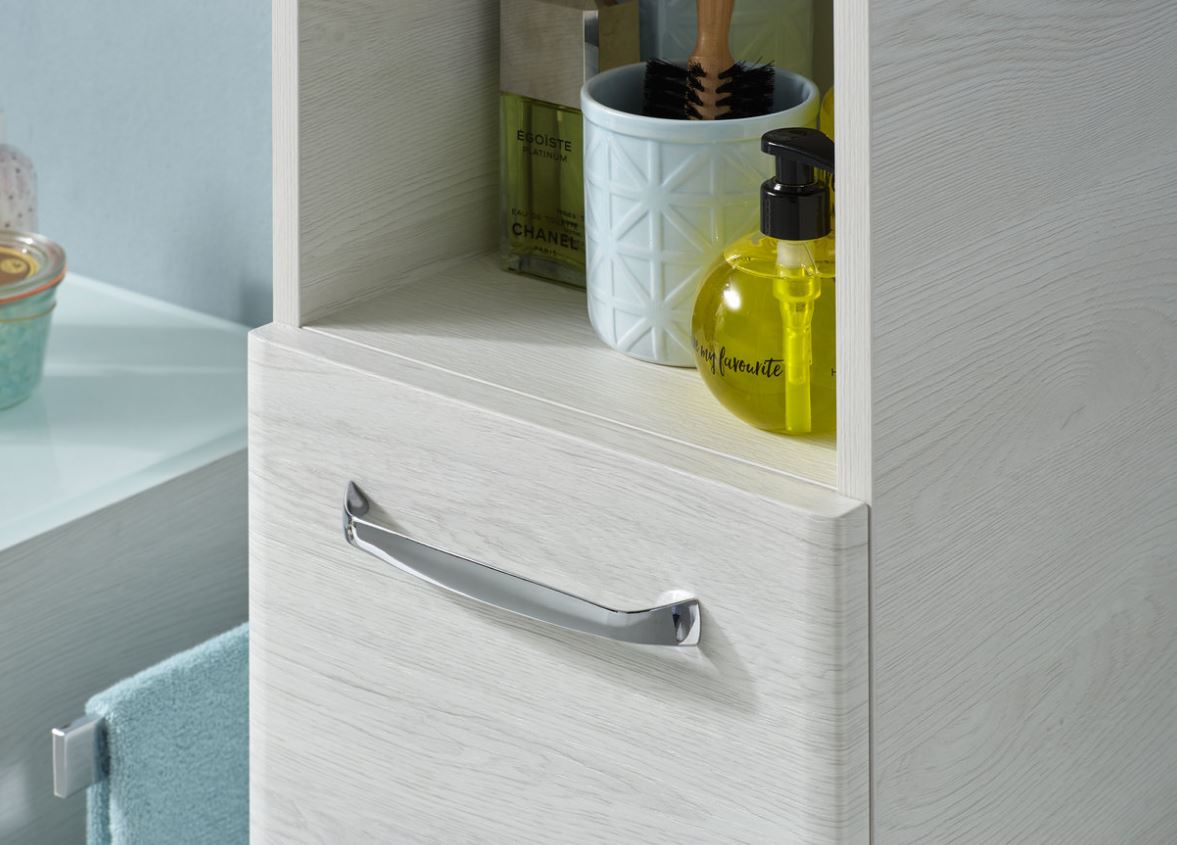 Front und Korpus des Modelles sind in Eiche Weiß quer Nachbildung gehalten. Die Bügelgriffe und das Fuß-Set sind in Chrom Glanz ausgeführt. Die Oberflächen der Möbel sind absolut pflegeleicht und lassen sich auch ohne agressive Reiniger hervorragend säubern.