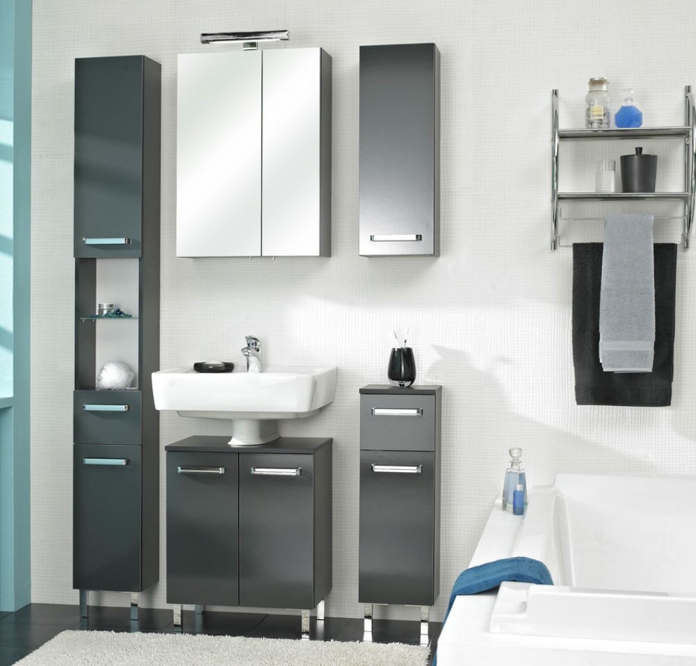Das Badmöbelset von Pelipal 311 besteht aus einem praktischen wie geräumigen Waschbeckenunterschrank mit 2 Drehtüren, Siphonausschnitt, Abdeckplatte und 4 Füße in Chrom Glanz sowie einem komfortablen Spiegelschrank mit integrierter LED-Bügelleuchte. Das Set hat eine Breite von 50 cm und ist hierdurch ideal für Ihr WC oder Gästebad geeignet. Die Möbel sind in modernem Anthrazit Glanz Dekor gehalten. Die Modelle werden mit einem Bügelgriff in Chrom Glanz geliefert. 311 bietet eine perfekt aufeinander abgestimmte Badmöbelserie für einen eleganten Look in Ihrem Badezimmer. Neben der hohen Qualität durch hochwertige Verarbeitung bietet das Set weitere tolle Kombinationen. Auch sind Modelle mit Schrankbreiten von 25 cm, 30 cm und 50 cm sowie mit einer geringen Tiefe von 20 cm in dieser Serie enthalten - die sogenannten Problemlöser. Tolle Beimöbel wie Hochschränke, Midischränke, Highboards, Wandschränke und Unterschränke machen Ihr Badezimmer komplett. Innen sind die Badezimmermöbel von 311 mit weißem Melamin beschichtet: Ideal für eine schnelle Reinigung und weniger Feuchtigkeitsanfällig.
