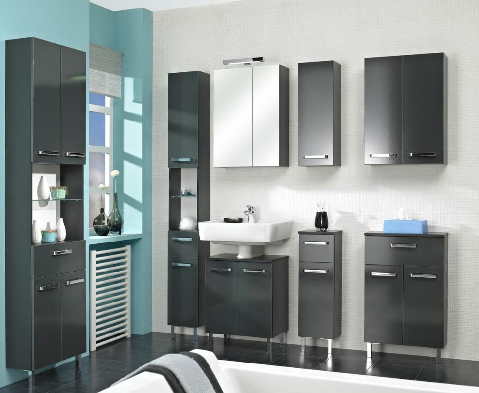 Die Front von 311 ist in Anthrazit Glanz und der Korpus in Anthrazit Dekor gehlaten. Eine absolute Besonderheit bie dieser Serie sind die sogennanten Problemlöser-Möbel. Das sind Möbel in den Breiten 25 cm, 30 cm und 50 cm mit einer geringen Tiefe von 20 cm.