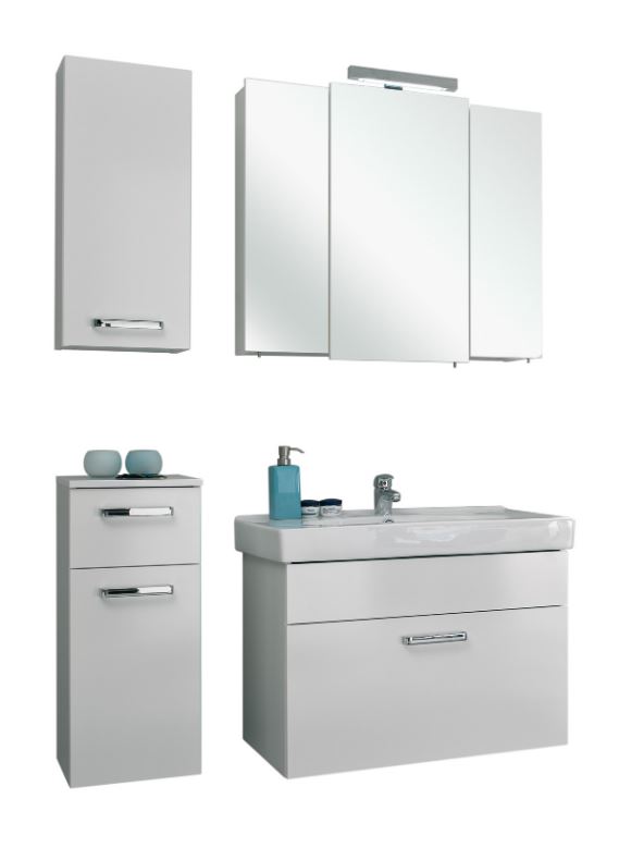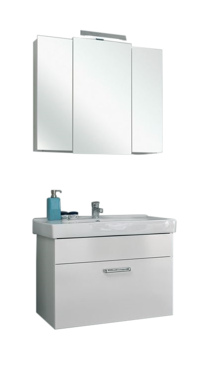 Pelipal Quickset 312 - stilvolle und zeitlos schöne Badezimmermöbel in weißem Glanzdekor der Modellreihe 312. Das hochwertige Set besteht aus einem Waschtisch aus pflegeleichten Keramik mit passendem Unterschrank inklusive geräumigen Auszug und einem komfortablen Spiegelschrank inklusive LED-Bügelleuchte. Das Set hat eine Breite von 80 cm und ist für die wandhängende Montage vorgesehen. Andere Möbelstücke dieser Modellreihe sind auch auf Füßen stehend montierbar. Die Möbel sind mit einem dezenten Stangengriff alufarben versehen. Der Spiegelschrank ist mit 3 Türen und 6 Einlgeböden sehr praktisch ausgestattet und beinhaltet zudem Schalter und Steckdose. Das Modell 312 bietet Ihnen zudem eine große Auswahl an Beimöbeln. Es bleiben keine Wünsche offen!