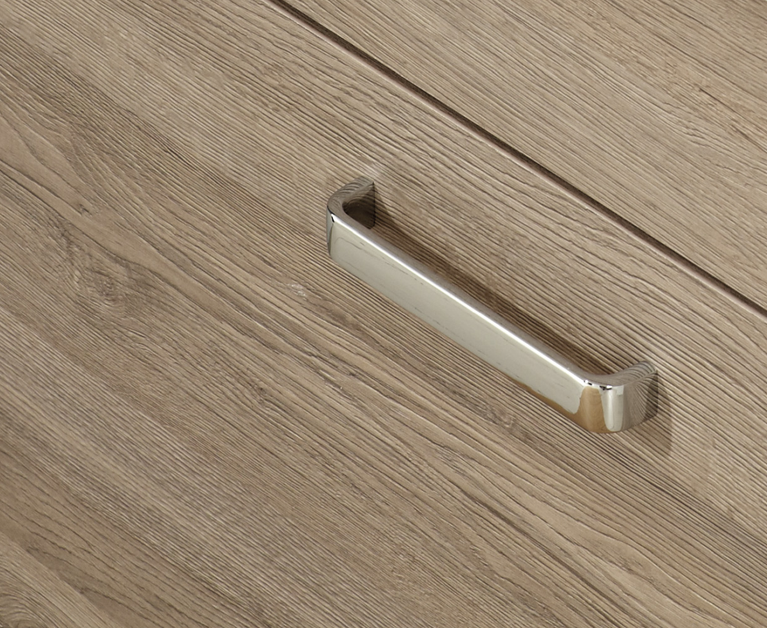 Die Fronten und Seitenteile sind in einem warmen, trendigen Eiche Braun - Sanremo Eiche Terra quer gefertigt. Die chrom glänzenden Griffe dazu sind serienmäßig im Lieferungumfang enthalten.
