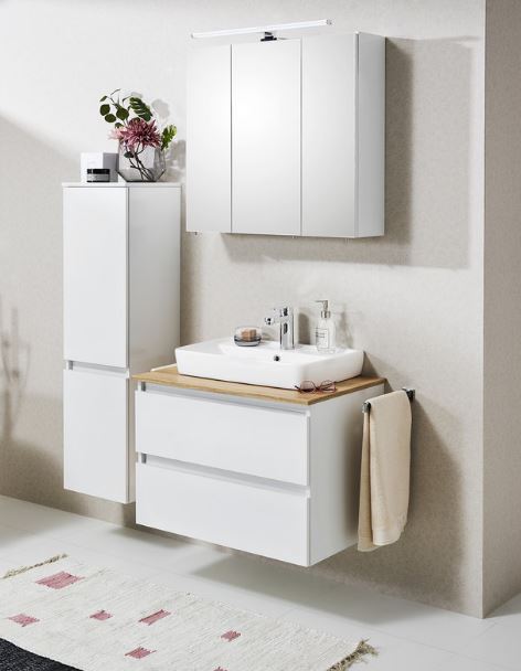 Das moderne Quickset Modell aus dem Hause Pelipal - Pelipal 360! Elegantes, klares Design wird gekonnt mit dem kompakten Keramik Aufsatzbecken kombiniert. Front und Korpus sind in Weiß Glanz gehalten. Die Fronten sind grifflos und die Waschtischplatte wird in Riviera Eiche Nachbildung gefertigt. Die Badmöbel sind völlig zeitgemäß und dennoch zeitlos.