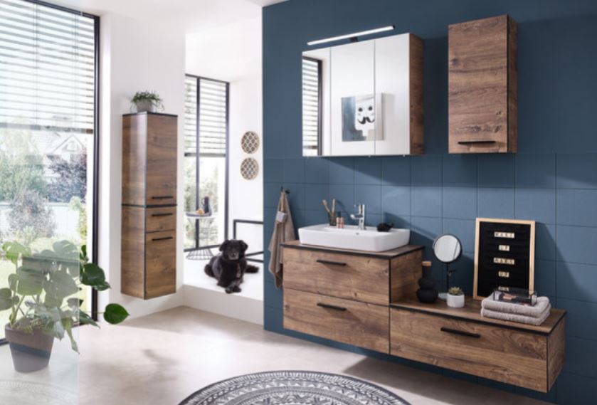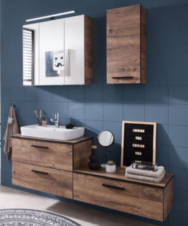 Dieses Badmöbelset 374 von Pelipal besticht durch ein aussagekräftiges und geradliniges Design welches in dieser Zusammenstellung aus einem Unterschrank inklusive zwei Auszügen, einem Keramikaufsatzbecken und einer Waschtischplatte sowie einem dreitürigen Spiegelschrank inkl. Aufsatzleuchte besteht. Ergänzt wird dieses Badezimmerset durch einen weiteren Unterschrank sowie einen Wandschrank. Das Quickset 374 von Pelipal ist im Farbton Eiche Ribbek quer Nachbildung gehalten und von schwarzen Kanten eingerahmt. Der Waschtisch ist weiß und hat eine Breite von 60 cm. Die dazugehörige Waschtischplatte wird ohne Ausschnitt geliefert. Diese ist 73 cm breit und hat daher einen leichten seitlichen Überstand. Der dazu passende Waschtischunterschrank ist 71 cm breit, 51 cm hoch und 44 cm tief.