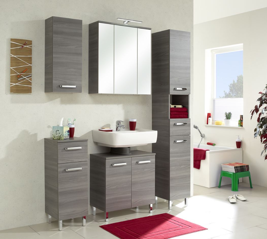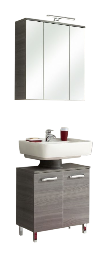 Das Badmöbelset von Pelipal Quickset 912 besteht aus einem einem praktischen, universalen Waschbeckenunterschrank mit Siphonausschnitt und 2 Drehtüren wodurch viel Stauraum entsteht und einem komfortablen Spiegelschrank mit integrierter Beleuchtung, Schalter und Steckdose. Das Set hat eine Breite von 60 cm und ist hierdurch ideal für ein komfortables Gästebad oder WC geeignet. Das Modell Pelipal Quickset 912 hält Möbelstücke in Sangallo Grau Quer Holzoptik für Sie bereit. Ein schöner, harmonischer und zeitloser Farbton welcher sich in verschiedene Wohnbereich einwandfrei integrieren lässt. Die Modelle werden mit einem Bügelgriff in Chrom Glanz geliefert. Sie können Ihr Badmöbelset mit praktischen Beimöbeln dieser Serie optimal ergänzen. Es stehend Ihnen ein Hochschrank, Unterschrank sowie Wandschrank zur Verfügung. Diese funktionalen Schränke bringen viel Stauraum und Ordnung in Ihr gut sortiertes Badezimmer. Die Beimöbel werden stehend auf Füßen montiert.
