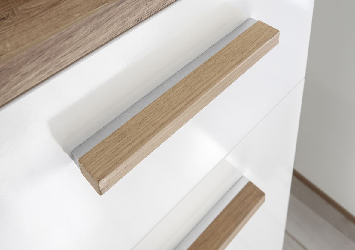 Die Front des Modelles 923 ist in Weiß Glanz, der Korpus in Weiß Glanz / Riviera Eiche quer Nachbildung gehalten. Die Möbel sind mit Holzgriffen versehen. Die Füße sind in Holzoptik Riviera Eiche Nachbildung gehalten, ebenso die Regalelemente. Die Oberflächen der Möbel sind absolut pflegeleicht und lassen sich auch ohne agressive Reiniger hervorragend säubern.