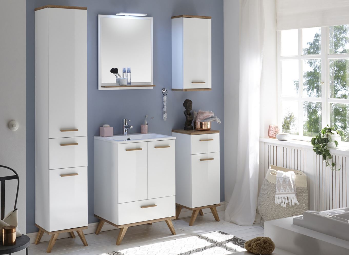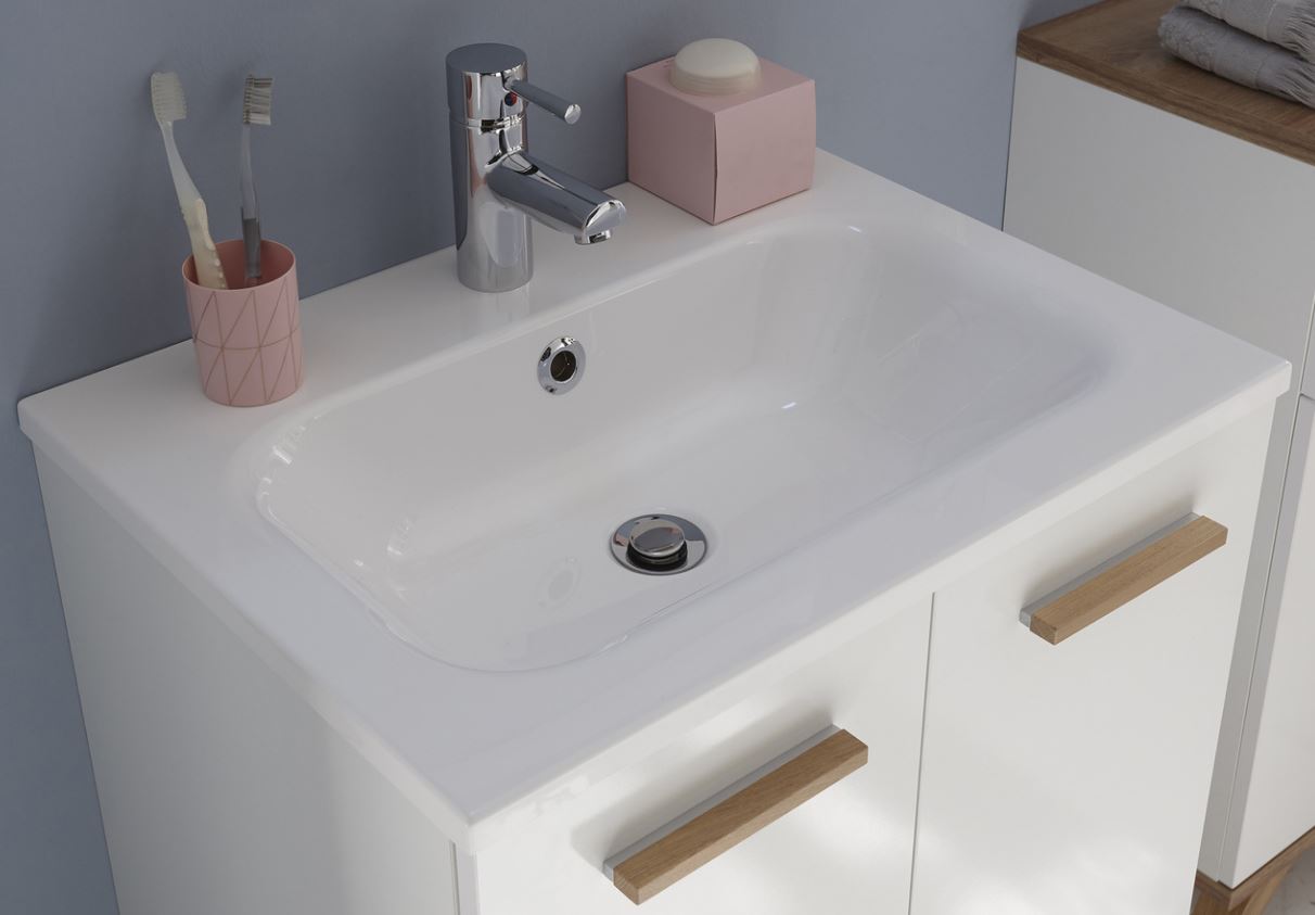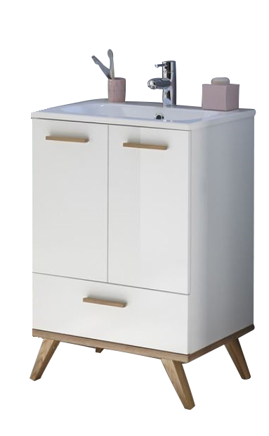Das Badmöbelset von Pelipal 923 besteht aus einem pflegeleichten, modernen Mineralmarmorwaschtisch und einem praktischen wie geräumigen Waschbeckenunterschrank mit einem Auszug und 2 Drehtüren inklusive Türdämpfer. Der Unterschrank wird stehend auf Füßen in Holzoptik montiert. Das Set hat eine Breite von 60 cm und ist hierdurch ideal für ein komfortables Gästebad oder WC geeignet. Das Modell Pelipal 923 präsentiert sich skandinavisch angehaucht. Eine schöne warme Kombination aus Weiß Glanz mit Holzelementen in Riviera Eiche Nachbildung sorgen für ein stilvolles Ambiente. Die Holzgriffe heben sich von der weißen Front in Glanz wunderbar ab und bilden einen tollen Kontrast. Auch die Füße in Holzoptik ergänzen das Design einwandfrei. Das Modell 923 hält zudem tolle und praktische Beimöbel wie Hochschrank, Midischrank, Unterschrank und Wandschrank für Sie bereit. Diese funktionalen Schränke bringen viel Stauraum und Ordnung in Ihr gut sortiertes Badezimmer. Die Beimöbel werden stehend auf Füßen montiert.