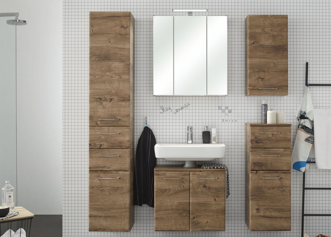 Das Badmöbelset von Pelipal Quickset 943 besteht aus einem geräumigen Waschbeckenunterschrank mit 2 Drehtüren und Siphonausschnitt sowie aus einem Spiegelschrank inklusive Aufsatzleuchte, Schalter und Steckdose. Der Unterschrank ist universal einsetzbar, ein Waschtisch ist hierbei nicht inkludiert. Sie erhalten anstelle des Spiegelschrankes auch einen modernen Flächenspiegel mit LED-Umrandung und Touchsensor. Der Unterschrank wird wandhängend oder wahlweise auf Füßen montiert. Das Set hat eine Breite von 60 cm und ist hierdurch ideal für ein komfortables WC oder Gästebad geeignet. Das Modell Pelipal 934 Filo präsentiert sich in einem warmen und rustikalen Design. Die Farbausführung in Eiche Ribbeck quer Nachbildung wirkt harmonisch und gemütlich. Einen angenehmen Kontrast hierzu bilden die Bügelgriffe in Chrom Glanz. Das Modell Pelipal Quickset 943 hält zudem tolle und praktische Beimöbel wie Hochschrank, Midischrank, Unterschrank und Wandschrank für Sie bereit. Diese funktionalen Schränke bringen viel Stauraum und Ordnung in Ihr gut sortiertes Badezimmer. Die Beimöbel werden wahlweise wandhängend oder stehend auf Füßen montiert.