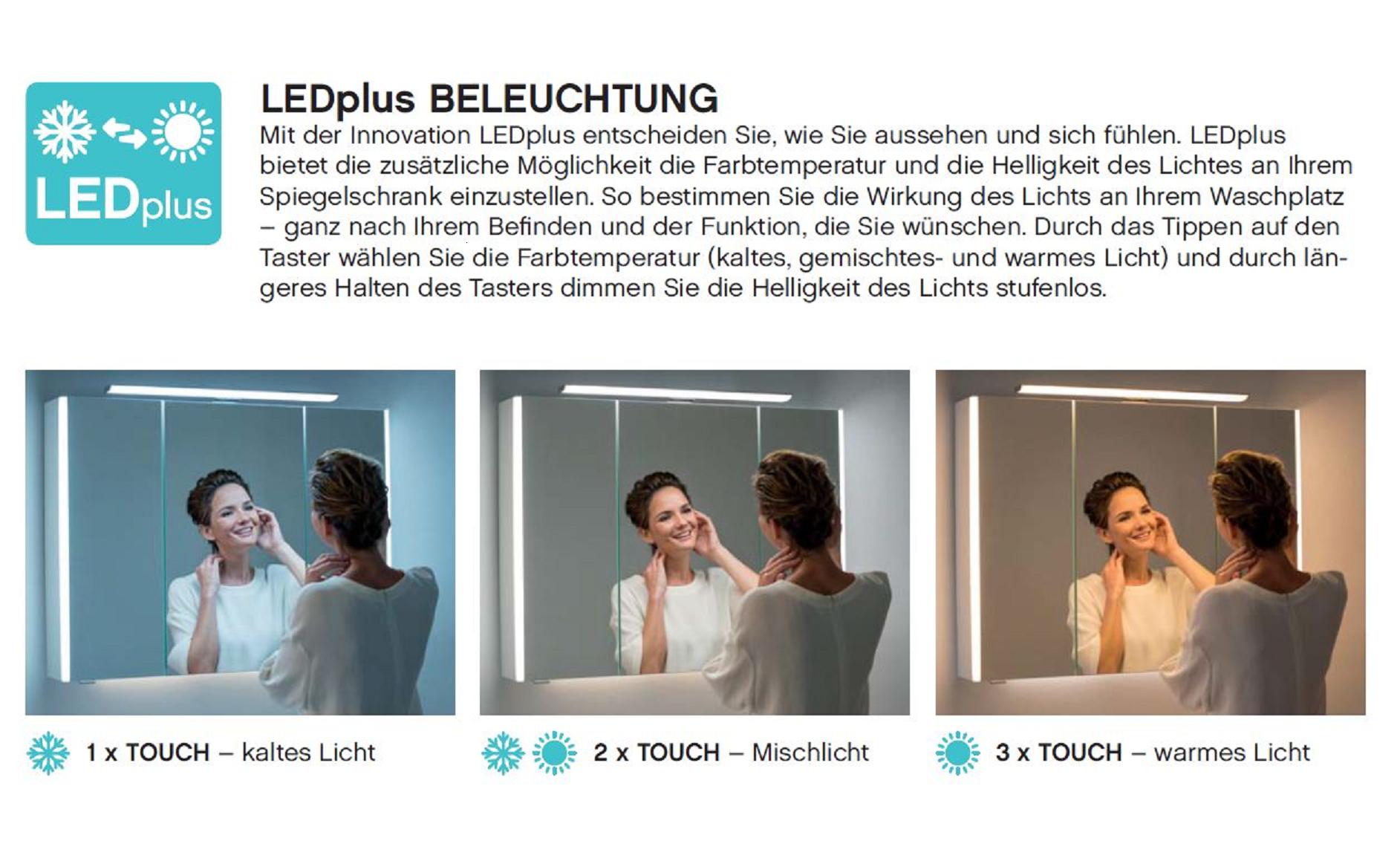 Die Besonderheit dieses tollen Spiegelschrankes liegt in der LEDplus-Beleuchtung. LEDplus bietet die zusätzliche Möglichkeit die Farbtemperatur und die Helligkeit des Lichtes selber einzustellen. Ganz nach Ihrem Befinden.