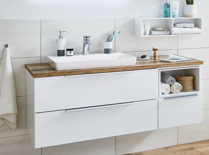 Das Puris Aspekt Aufsatzbecken ist aus dem Material Mineralguss und verfügt über eine Armaturbohrung. Die dazugehörige Waschtischplatte hat eine Breite von 130,6 cm und ist in tollen Dekorfarben erhältlich. Darunter befindet sich ein Waschtischunterschrank mit zwei Auszügen und einem weiteren Unterschrank mit einem Einschubregal. Auch hier gibt es diverse Möglichkeiten um den Unterbau nach Ihren Wünschen zu gestalten.