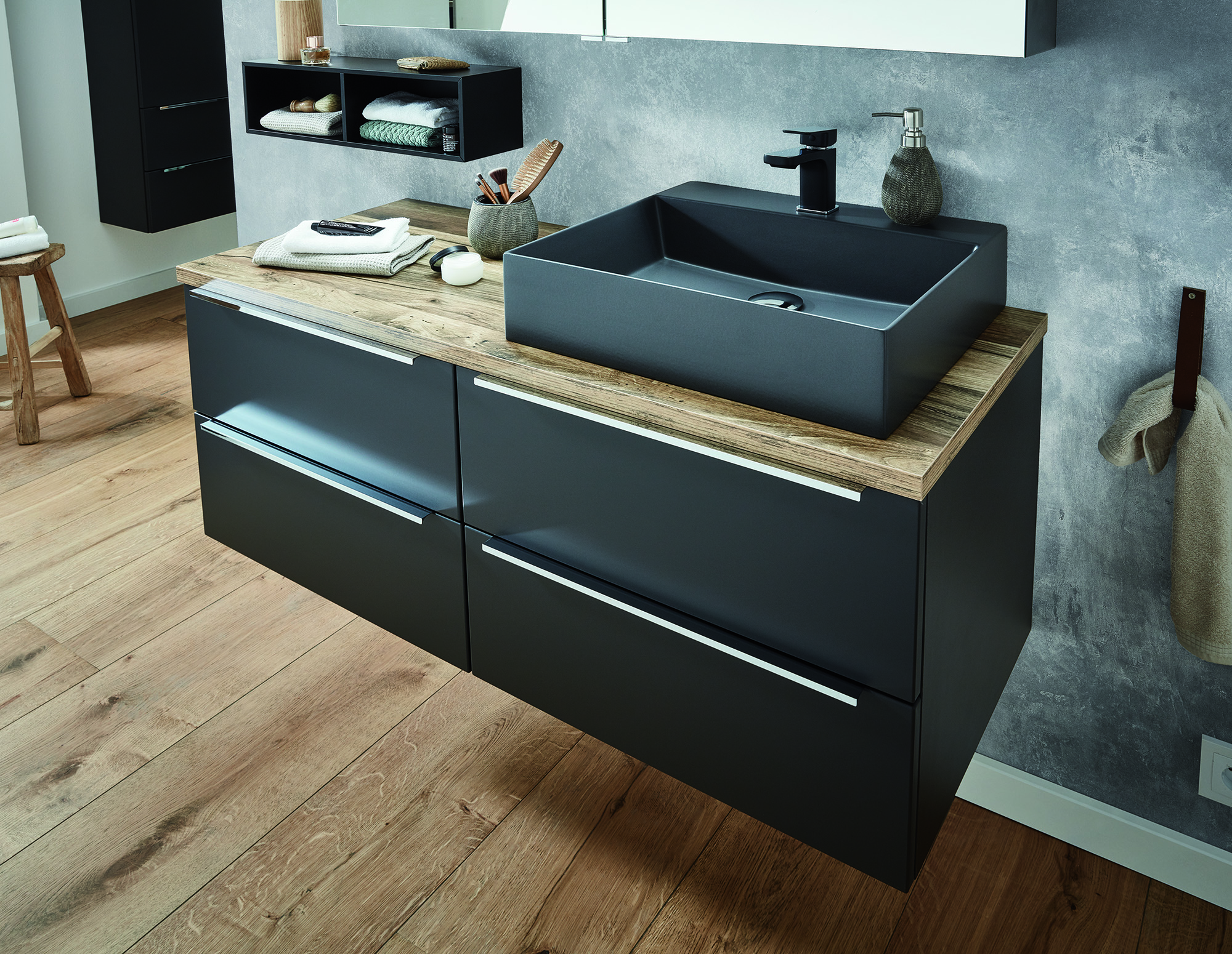 Der Badmöbel-Konfigurator der Serie Puris Aspekt beinhaltet in der Breite 120 cm ein wunderschönes schwarzes Aufsatzbecken aus Keramik sowie zwei geräumige Waschtischunterschränke mit je zwei Auszügen. Diese moderne Grundvariante können Sie nun nach Belieben ändern und mit tollen Spiegelschränken sowie Flächenspiegeln ergänzen. Es stehen Ihnen hochwertige Alternativen im Bereich Aufsatzbecken zur Verfügung. Auch der Unterbau der Waschtische kann individuell geändert werden. Zwischen Waschtisch und Waschtischunterschrank befindet sich eine moderne Dekor- Zwischenplatte.