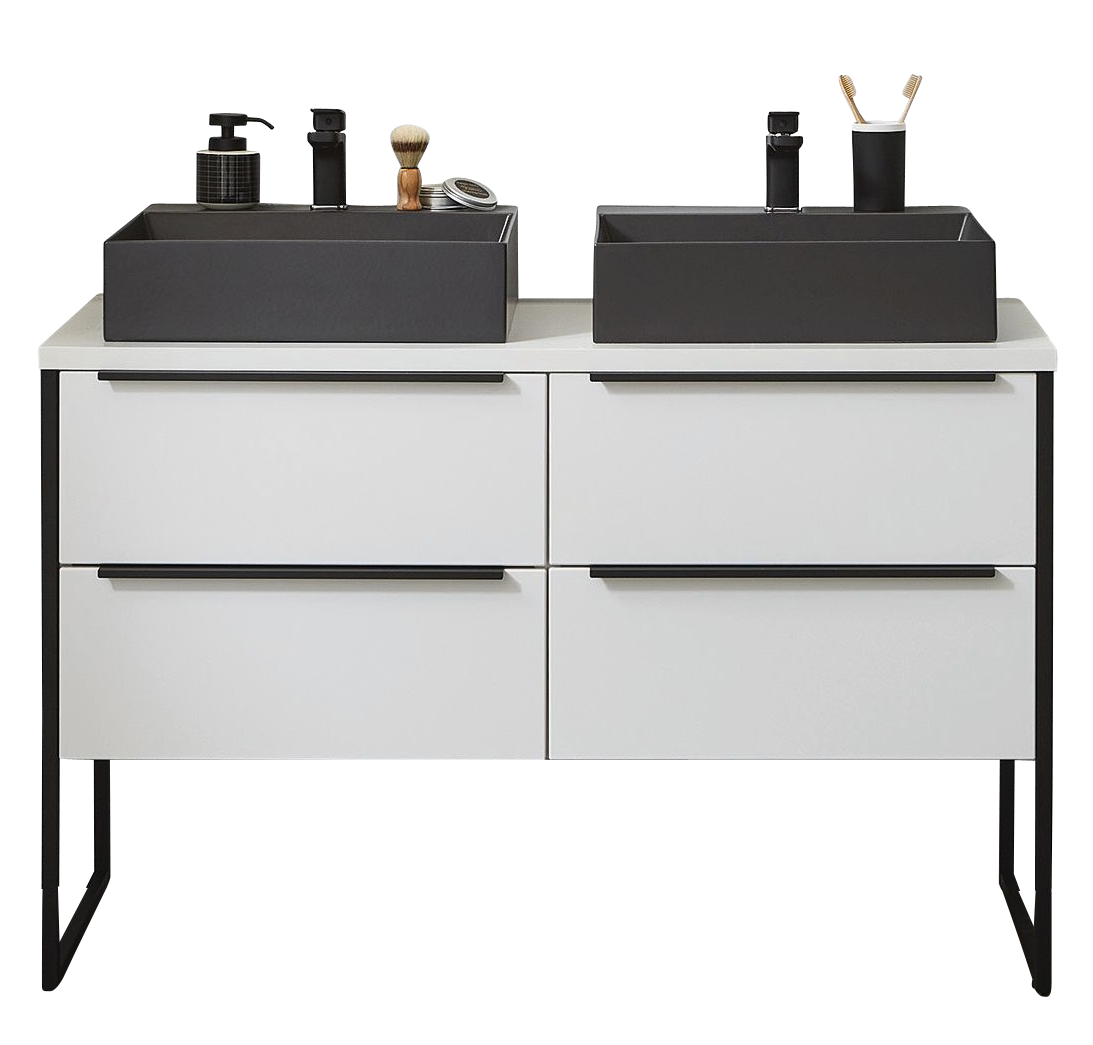 Das 120 cm breite Doppelwaschtisch-Set beinhaltet zwei wunderschöne Aufsatz-Waschtische in Schwarz matt aus Keramik sowie zwei hochwertige Waschtischunterschränke mit je zwei Auszügen und eine Dekor-Zwischenplatte. Das Badmöbel-Set von Puris Aspekt ist ein absolutes optisches Highlight und verzaubert Ihr Badezimmer mit einer extra großen Portion Glanz und Esprit.