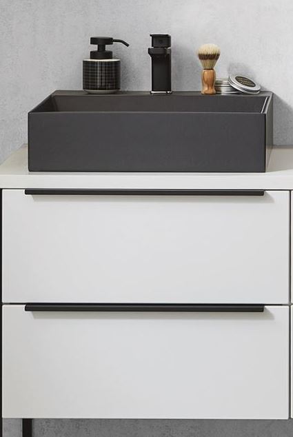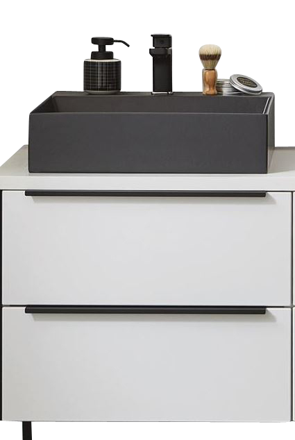 Das 60 cm breite Waschtisch-Set beinhaltet einen wunderschönen Aufsatz-Waschtisch in Carbone Schwarz aus Keramik sowie einen hochwertigen Waschtischunterschrank mit zwei Auszügen und eine Dekor-Zwischenplatte. Das Badmöbel-Set von Puris Aspekt ist ein absolutes optisches Highlight und verzaubert Ihr Badezimmer mit einer extra großen Portion Glanz und Esprit.