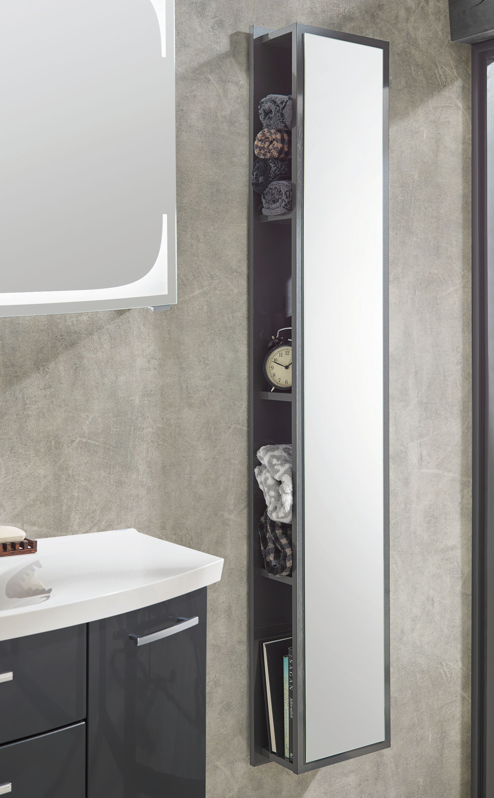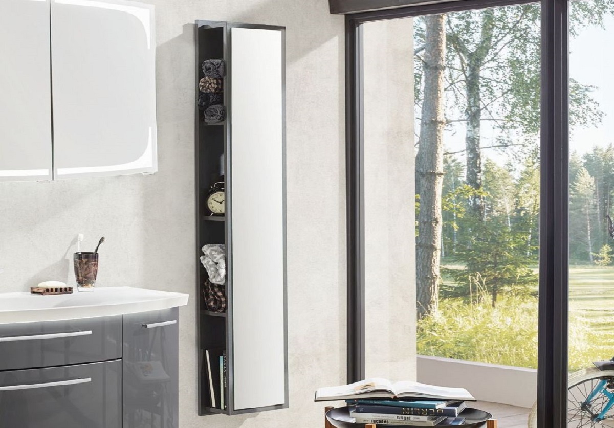 Das außergewöhnliche Regal findet in jedem Einrichtungsstil seinen Platz. Das Besondere an diesem Bad-Regal ist die Spiegelfläche, welche dafür sorgt, dass das Badezimmer größer wirkt. Weiterhin finden tägliche Badutensilien in den vier Ablagefächern ihren Platz und sind dank der Spiegelfläche ein bisschen versteckt.