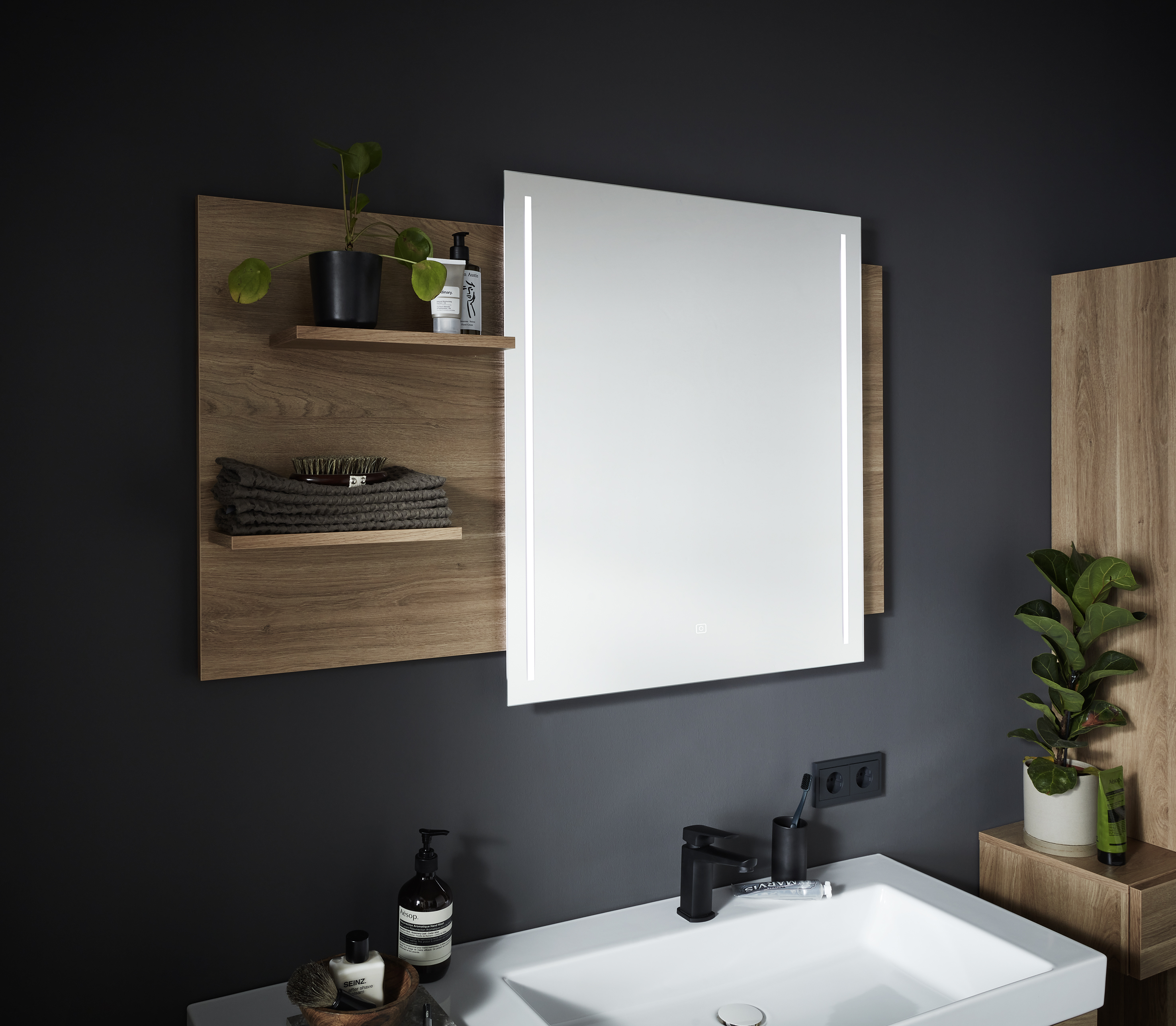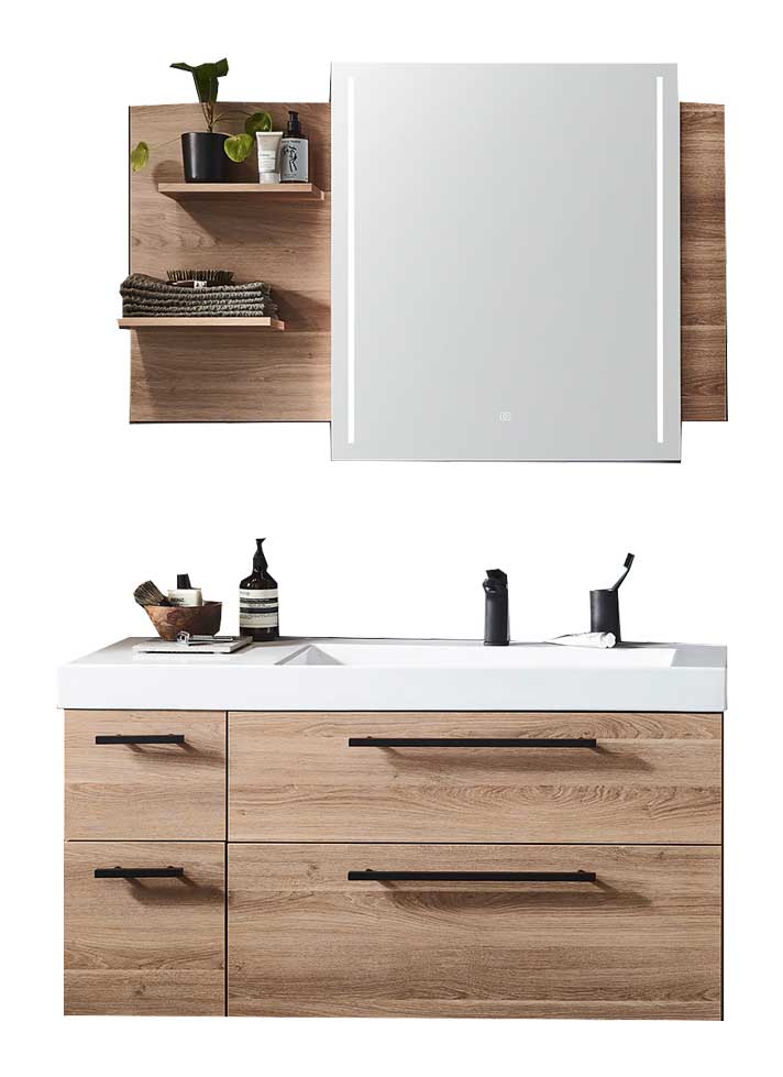 Besonders ins Auge fällt das blockartige, moderne und gerade Design. Das Becken verfügt über ein Clou Ab-und Überlaufsystem in chrom. Der Puris Waschtischunterschrank sorgt mit zwei und zwei kleinen Auszügen für ausreichend Stauraum der täglichen Pflegeartikel. Ergänzt wird dieses hochwertige Badmöbel-Set durch den modernen Badspiegel welcher auf einer Trägerplatte in Korpusdekor perfekt wirken kann. Der Flächenspiegel verfügt weiter über zwei senkrechte LED-Lichstreifen und einen Touch LED-Dimmer sowie ein linksseitiges Regal.