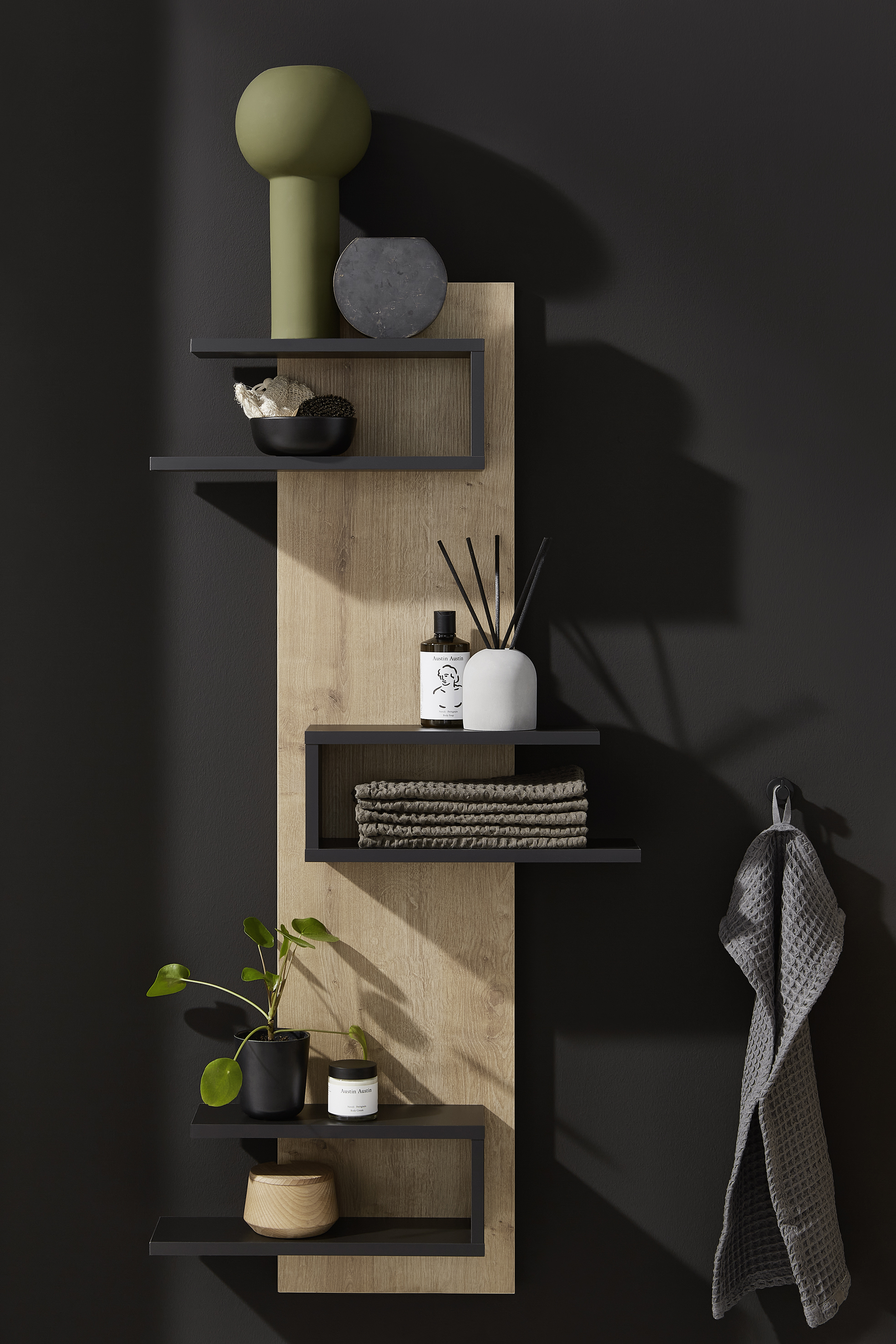 Das Badregal RG 103004 wird ebenso in Korpusfarbe geliefert. Hier können nur die Frontblenden abgesetzt werden. Sehen Sie hierzu die Option "Auswahl Frontblenden".