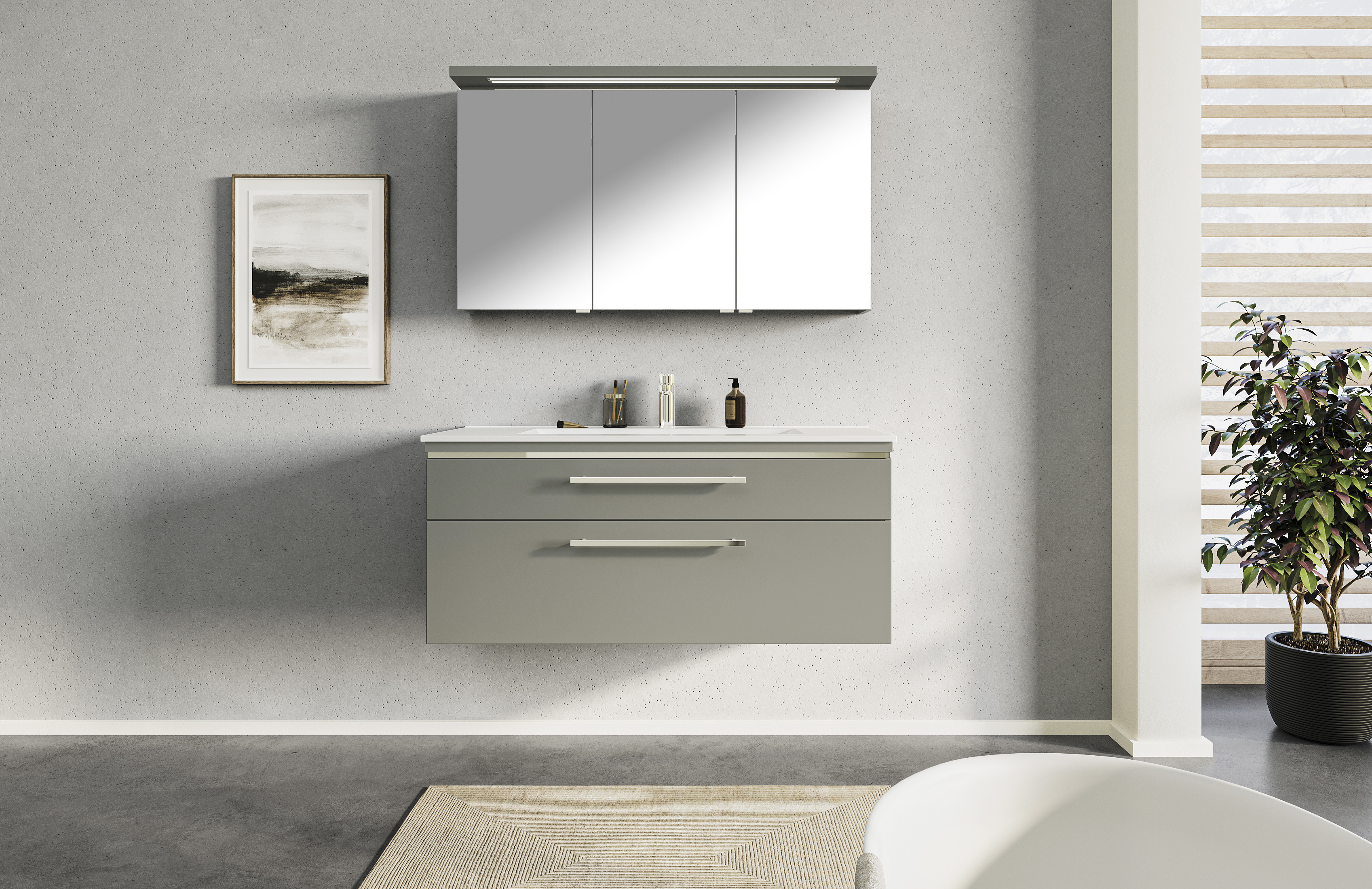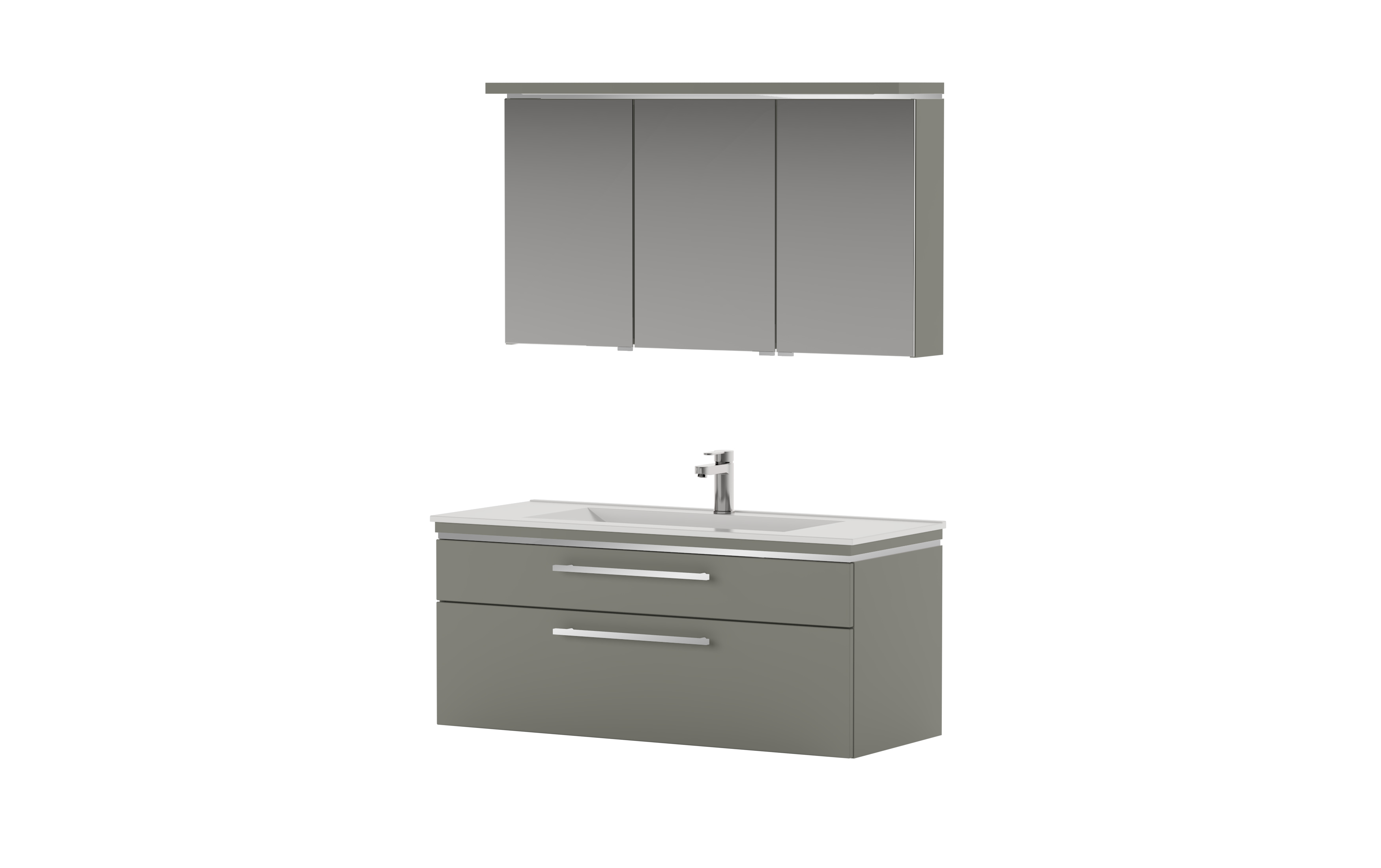 Puris Cool Line Badmöbel Set 122 cm breit setzt sich aus einem Einzel-Waschtisch, einem Waschtischunterschrank und einem dreitürigen Spiegelschrank zusammen.
