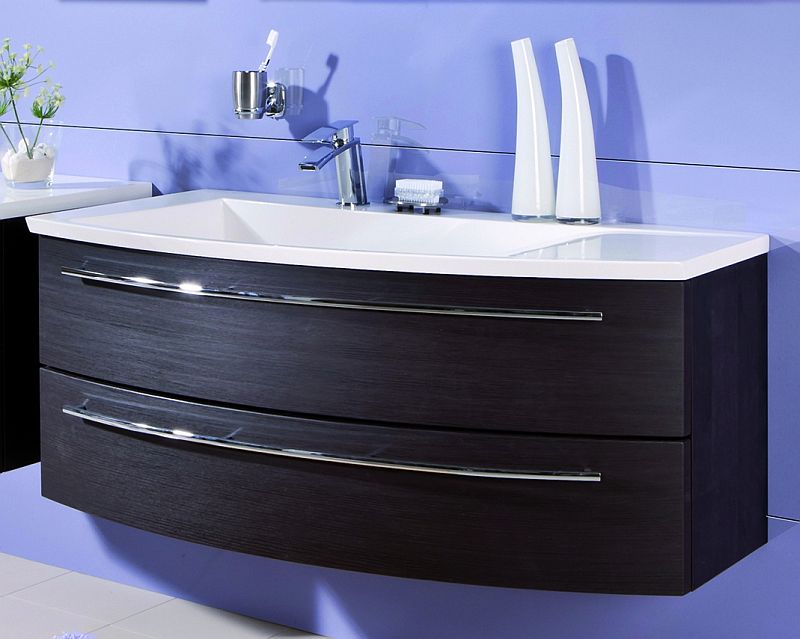 Der Waschbecken-Unterschrank ist mit zwei geräumigen Schubkästen ausgestattet. Die Schubladen sind serienmäßig mit einem erstklassigen Dämpfungssystem ausgestattet, was für ein leises Schließen garantiert. Ein optisches Highlight sind auch die schlanken Chromgriffe, welche ebenfalls das typisch geschwungene Design der Badmöbel spiegelt.