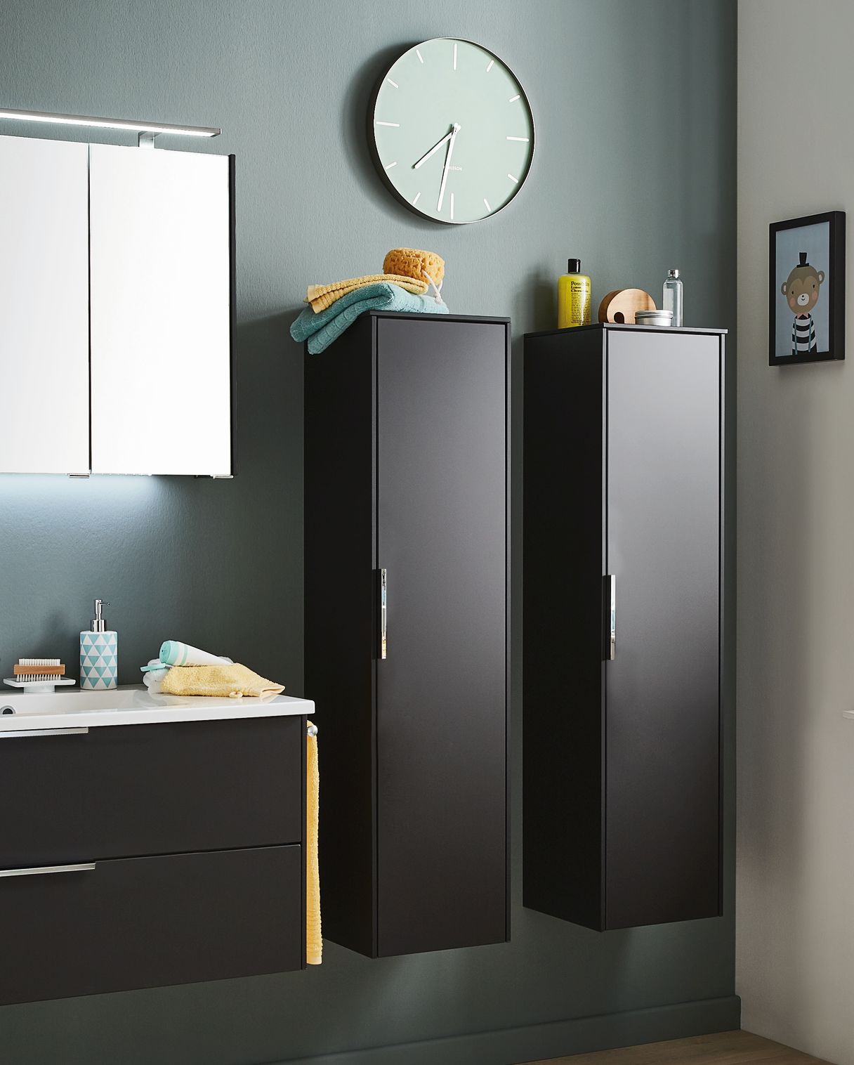 Der Badschrank von Puris d.light ist ein hilfreicher Begleiter im Badezimmer. Der 32,2 cm breite Mittelschrank ist mit einer Tür, vier Glaseinlegeböden und einer Abdeckplatte ausgestattet. Das Highlight sind die seitlichen Aufdopplungen, welche das Badmöbel-Design optisch abrunden. Weiterhin können Sie auswählen, ob sich die Schranktür nach links oder rechts öffnen soll, dadurch können Sie je nach Bedarf und Räumlichkeiten den Mittelschrank integrieren.
