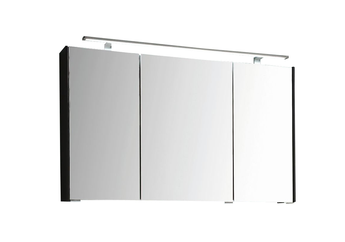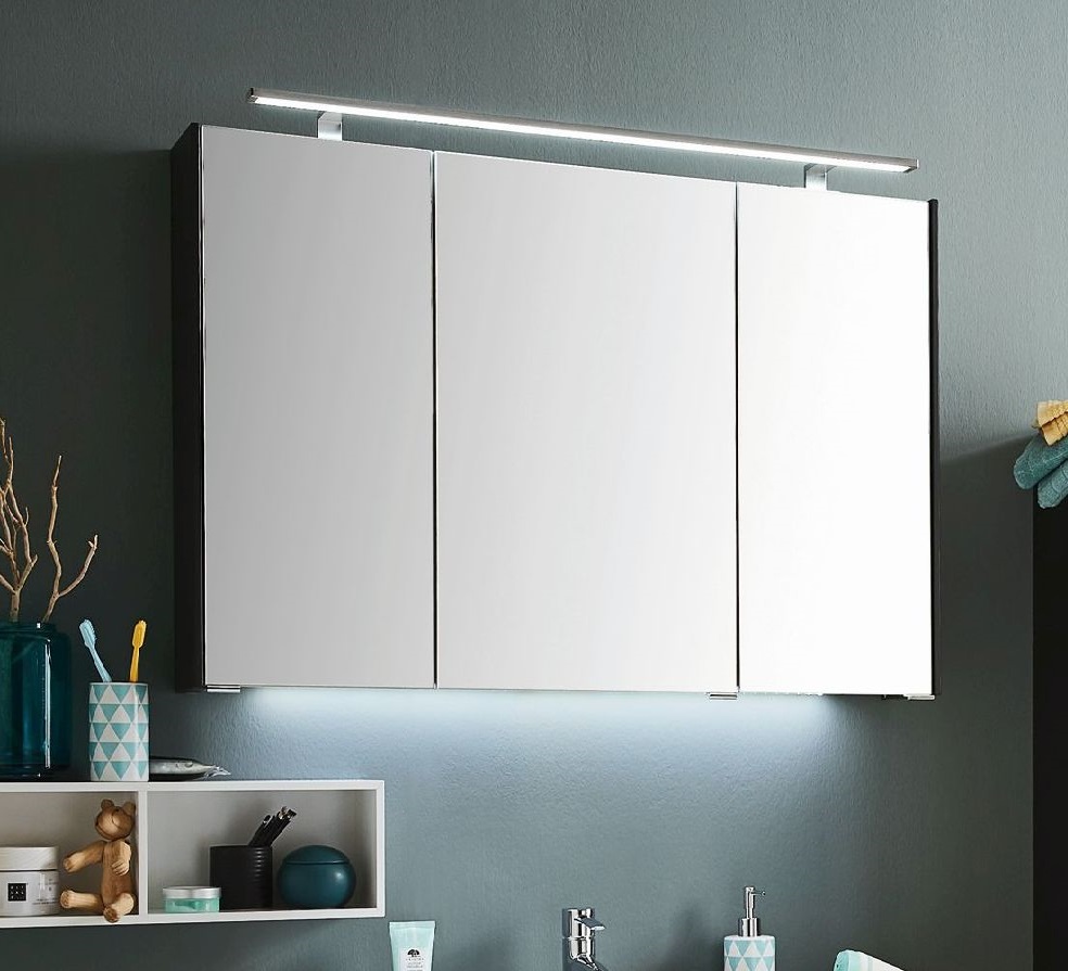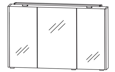 Der 102 cm breite Puris d.light Spiegelschrank ist vormontiert und wandhängend. Er besteht aus drei Spiegeltüren auf Trägerplatte, zwei Mittelwänden, drei Glaseinlegeböden und einer LED-Aufsatzleuchte. Im Schrankinneren befindet sich noch ein Schalter-Steckdosen-Element. Der Spiegelschrank bietet Stauraummöglichkeiten für Kosmetika, Pflegeprodukte und vieles mehr. Für eine gute Ausleuchtung der Spiegelfront sorgt die LED-Aufbauleuchte.