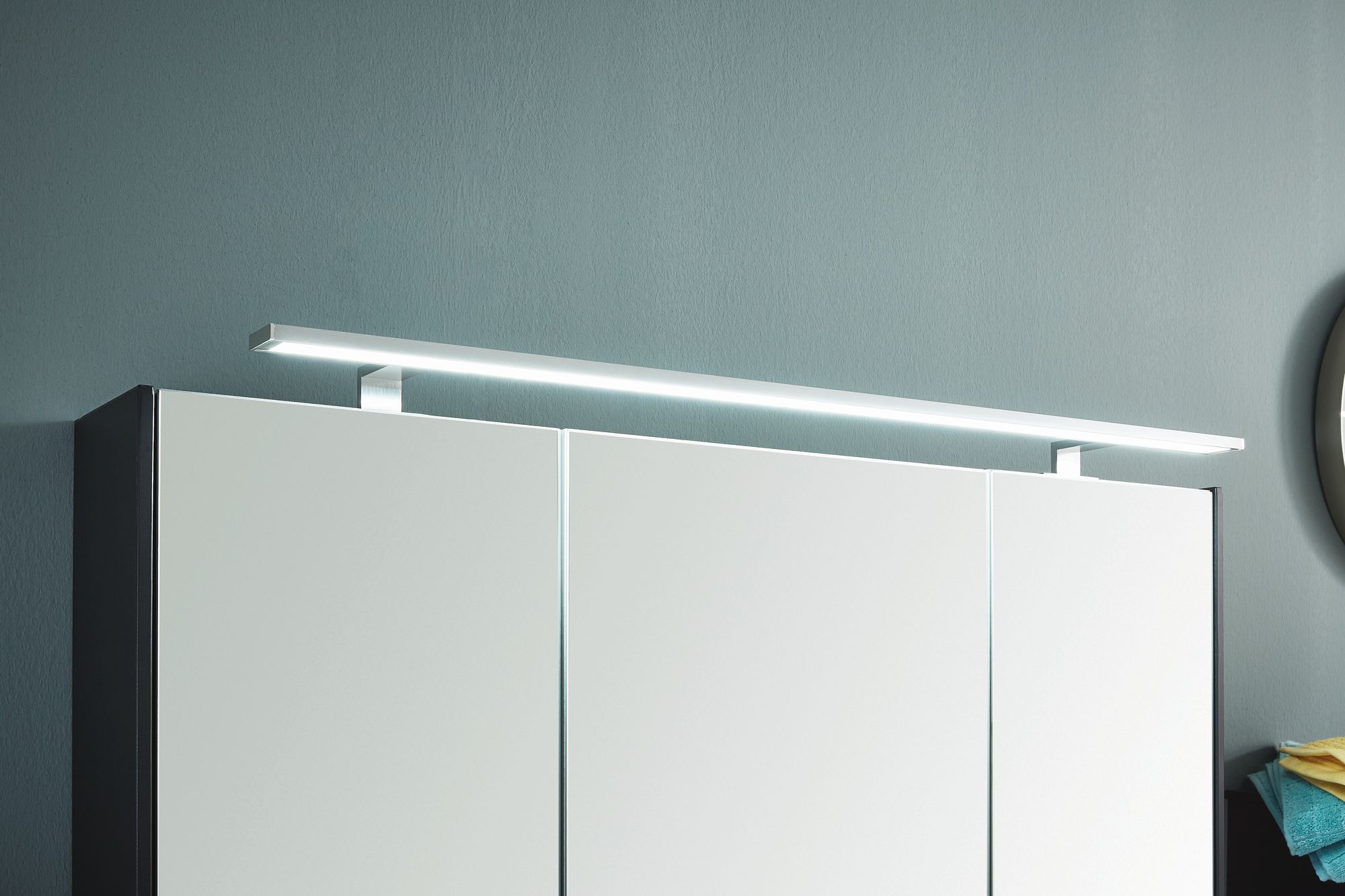 Alternativ kann man eine LED-Waschplatzbeleuchtung mitbestellen, welche unterhalb des Spiegelschrankes montiert wird. Die Zusatzbeleuchtung sorgt für ein helles, freundliches Ambiente im Badezimmer.