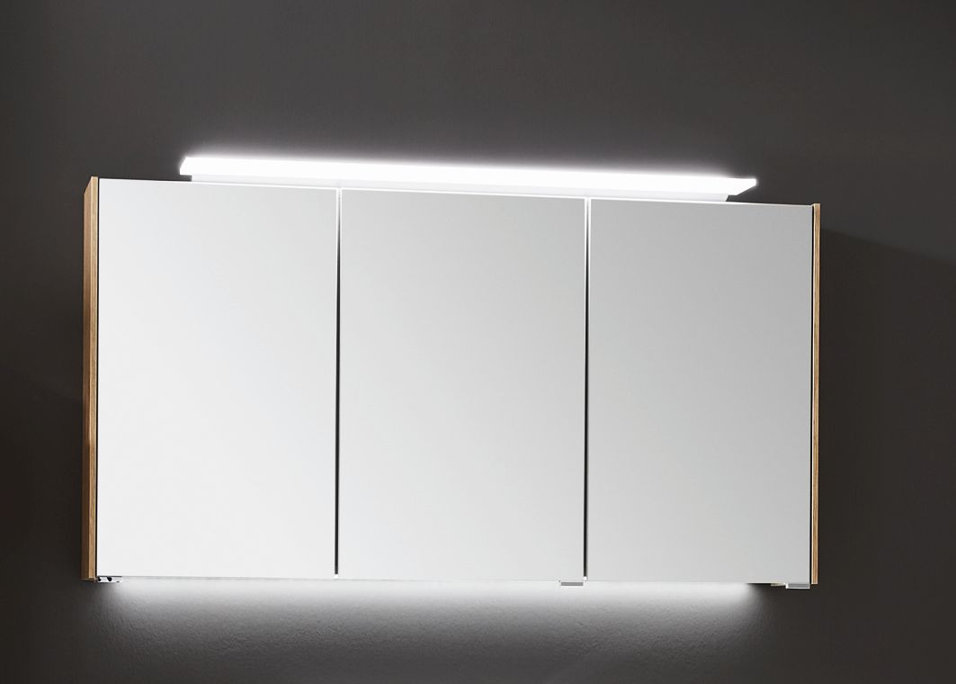 Der Spiegelschrank SET432D2 bietet ausreichend Stauraum für die täglichen Kosmetika, welche hinter den drei Spiegeltüren auf Trägerplatte übersichtlich aufbewahrt werden können. Weiterhin ist ein Schalter-Steckdosen-Element, eine Aufbauleuchte sowie drei Glasfachböden im Lieferumfang enthalten. Dank der effektiven LED-Aufsatzleuchte werden die drei Spiegeltüren super ausgeleuchtet und trägt zum angenehmen Wohlfühl-Ambiente im Badezimmer bei.