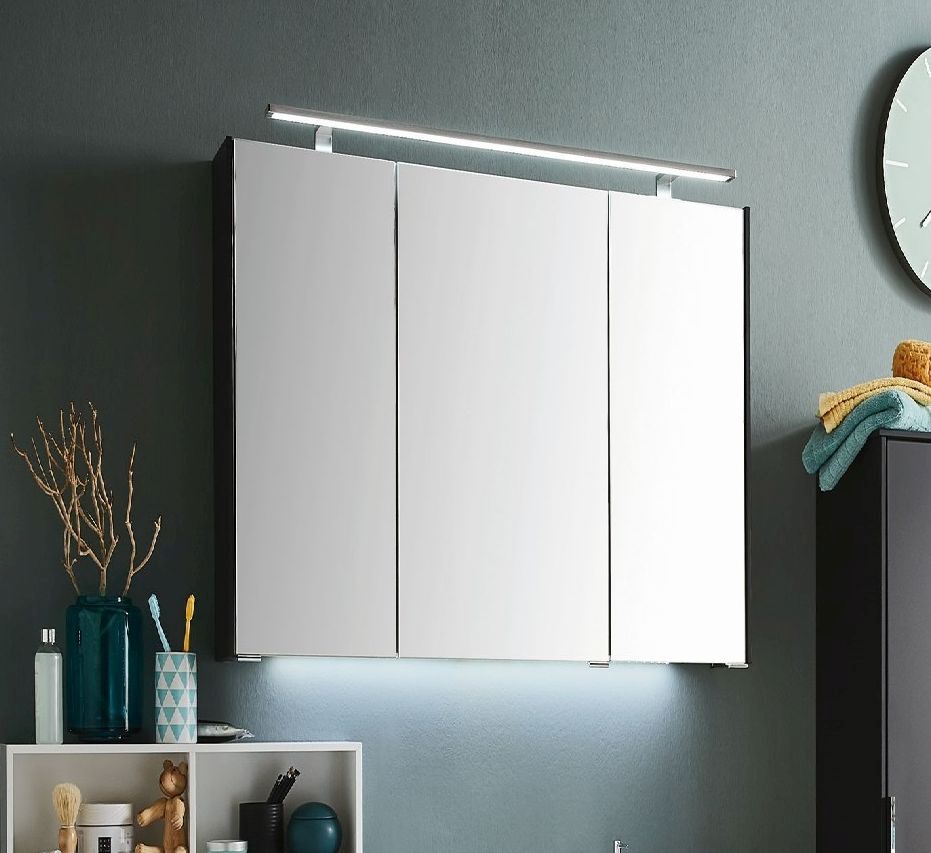 Der Puris d.light Spiegelschrank SET437D01 vervollständigt das Badmöbel-Set. Dieser ist mit drei Spiegeltüren auf Trägerplatte, einer LED-Aufbauleuchte und einem Schalter-Steckdosen-Element ausgestattet. Der Innenraum des Spiegelschranks wird mit zwei Mittelwänden und drei Glaseinlegeböden aufgeteilt.