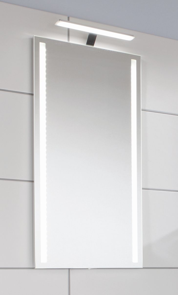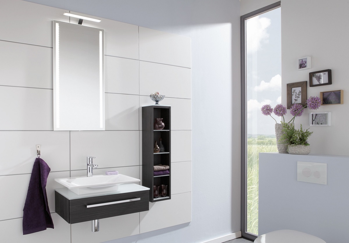Im Badset ist noch ein 40 cm breiter Puris for guests Badspiegel enthalten. Der Spiegel zeichnet sich insbesondere durch die beiden sandgestrahlten LED-Lichtfenster auf der linken und rechten Seite aus. Des Weiteren verfügt der Puris Badspiegel über einem Schalterelement und ist mit einer Außenkante in Chrom verziert. Optional kann zum Spiegel noch eine energiesparsame LED-Aufsatzleuchte mitbestellt werden um die Spiegelfront besser ausleuchten zu können.