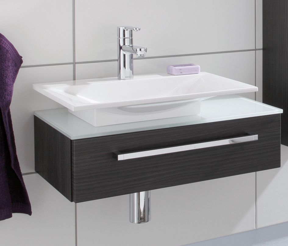 Der Puris for guests Waschplatz setzt sich aus einem Mineralguss Aufsatzwaschtisch, einer Glasplatte in Optiwhite und dem dazugehörigen Waschtischunterschrank zusammen.