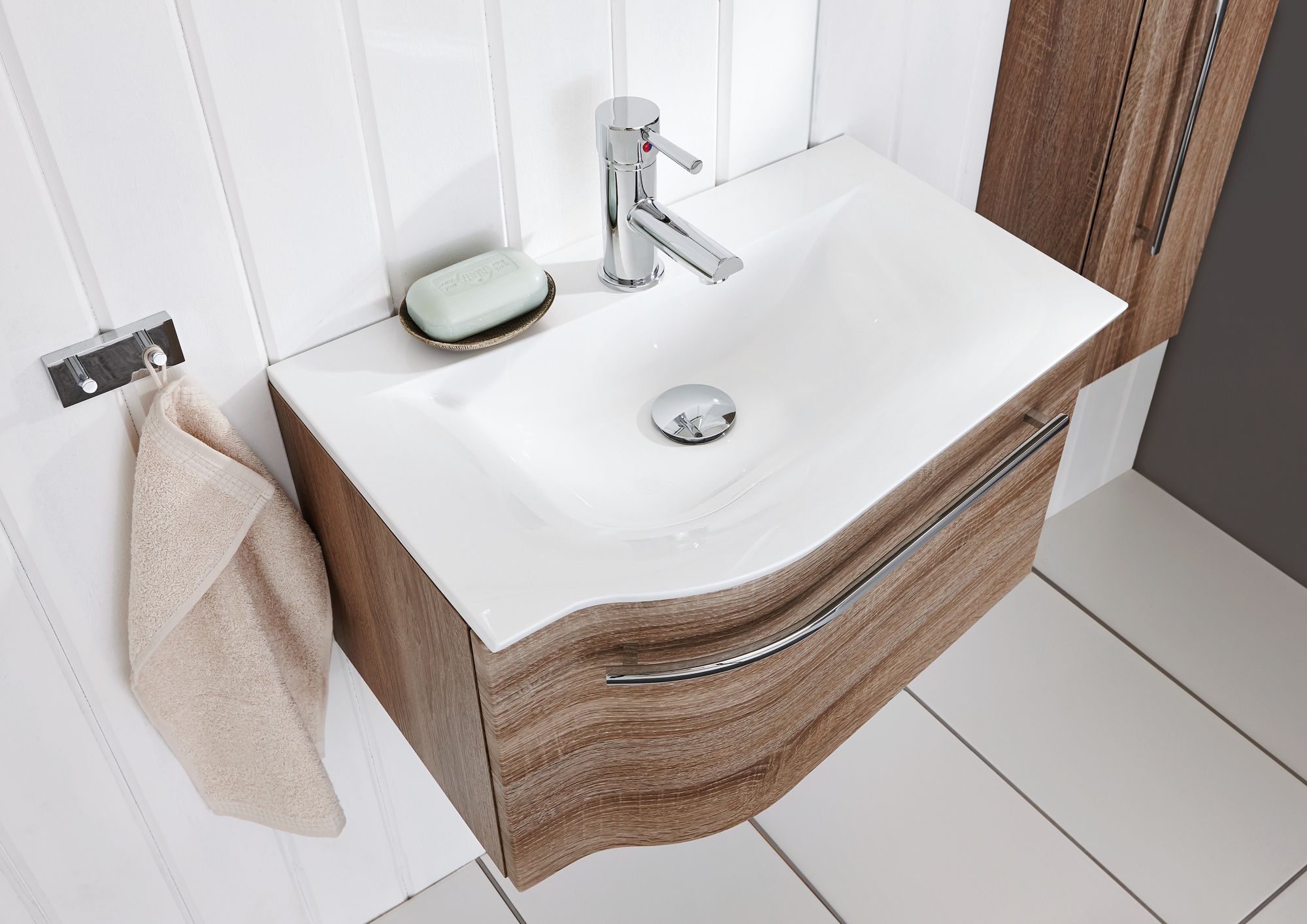 Die Badezimmermöbel aus der Serie können in unterschiedlich modernen Front- und Korpusdekore ausgewählt werden. Die Farbenvielfalt bietet ausreichend Raum für Individualität. Einerseits gibt es zeitlos schöne Farben und andererseits warme, einladende Holzfarben.
