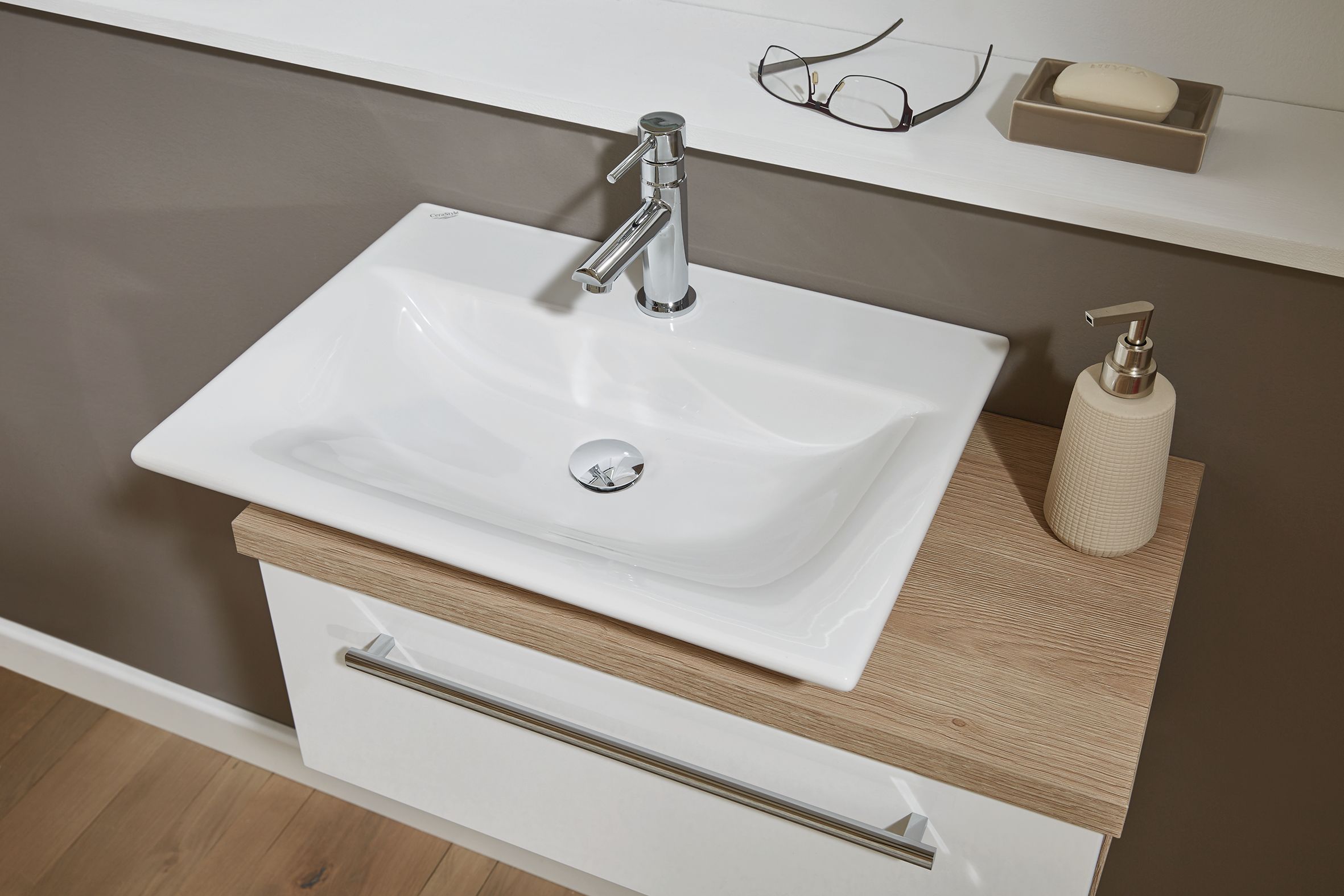 Unterhalb des Aufsatzbeckens befindet sich die praktische Abdeckplatte. Der Waschplatz wird mit dem Waschtischunterschrank abgeschlossen.