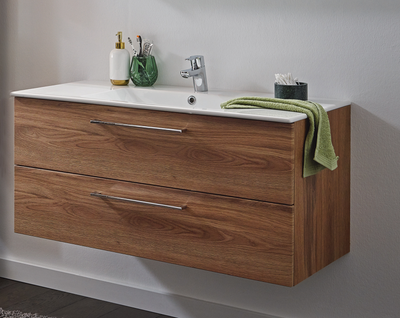 Unterhalb des Puris Fresh Waschtisches befindet sich ein Unterschrank mit zwei Auszügen inkl. Einzugsdämpfung. Im Puris Fresh Waschtischunterschrank lassen sich unterschiedliche Badutensilien wie zum Beispiel Handtücher verstauen.