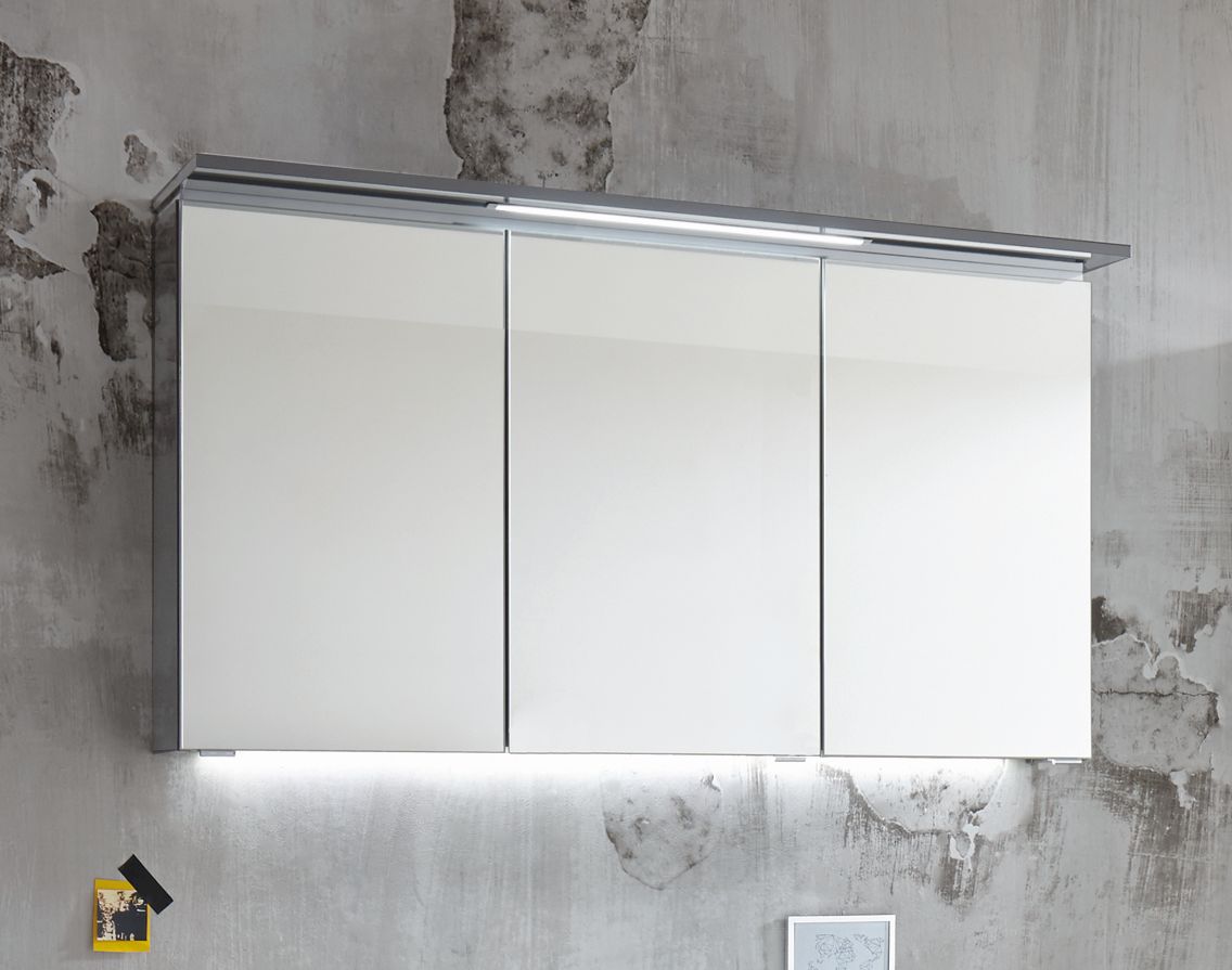 Um das Puris Fresh Badmöbel Set zu vervollständigen gesellt sich noch ein schöner dreitüriger Spiegelschrank hinzu. Dieser Puris Fresh Spiegelschrank rundet das Badezimmer – Gesamtbild harmonisch und stilvoll ab. Hinter den drei Spiegeltüren auf Trägerplatte befindet sich ausreichend Platz für die Unterbringung von täglichen Badutensilien, welche sofort für die morgendliche Routine griffbereit stehen. Die LED Beleuchtung vom Puris Spiegel ist im filigranen Gesimsboden eingearbeitet und sorgt für eine tolle Beleuchtung der Spiegelfront. Optional kann man eine LED-Waschplatzbeleuchtung mitbestellen, welche unterhalb des Spiegelschrankes montiert wird und zugleich den Waschtisch mit Unterschrank toll anleuchtet.