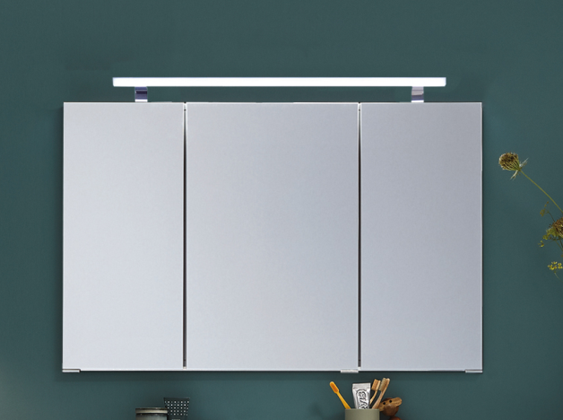 Die hochwertige Badkombination von Puris Fresh wird mit einem dreitürigen Spiegelschrank abgerundet. Der 120 cm breite Bad-Spiegelschrank sorgt mit der LED-Aufbauleuchte für ein angenehmes Wohlfühl-Ambiente im Badezimmer. Auch der Puris Spiegelschrank sorgt hinter den drei Spiegeltüren für ausreichend Stauraum der Pflegeartikel. Alternativ kann eine LED-Waschplatzbeleuchtung zum Spiegelschrank mitbestellt werden, welche unterhalb des Spiegels montiert wird.