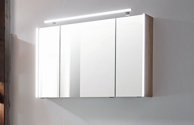 Der moderne Puris Fresh Spiegelschrank wird zum echten Highlight in Ihrem Badezimmer. Der dreitürige Spiegelschrank aus der aktuellen Badserie Puris Fresh ist mit Glaseinlegeböden, Schalter-Steckdosen-Element und einer schicken LED-Beleuchtung ausgestattet. Die seitlichen Beleuchtungsprofile sind nicht nur optisch ein toller Blickfang sondern überzeugen auch durch eine optimale Ausleuchtung der Spiegelfront. Hinter den drei Spiegeltüren auf Trägerplatte wird der Innenbereich mit Einlegeböden aus Glas untergliedert. Dadurch haben Sie einen tollen Überblick über die einsortierten Badartikel.