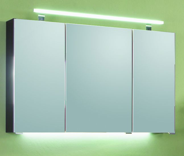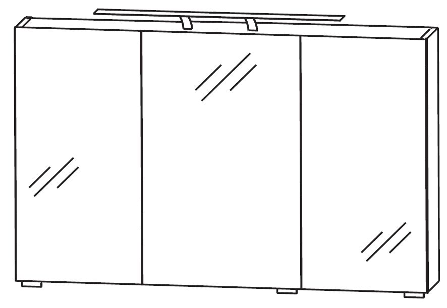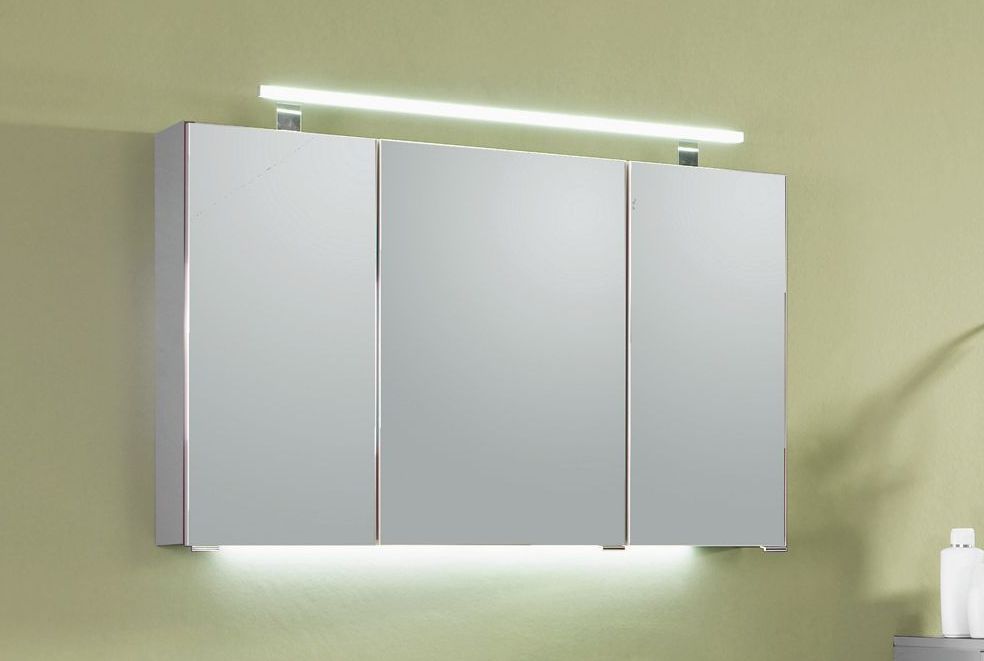 Der Puris Fresh Spiegelschrank S2A431267 ist 120 cm breit und mit drei Spiegeltüren, Glasfachböden, Schalter-Steckdosen-Element und einer LED Aufsatzleuchte ausgestattet. Die Türbreiten vom Spiegelschrank sind 38,8 cm / 41,2 cm / 38,8 cm.