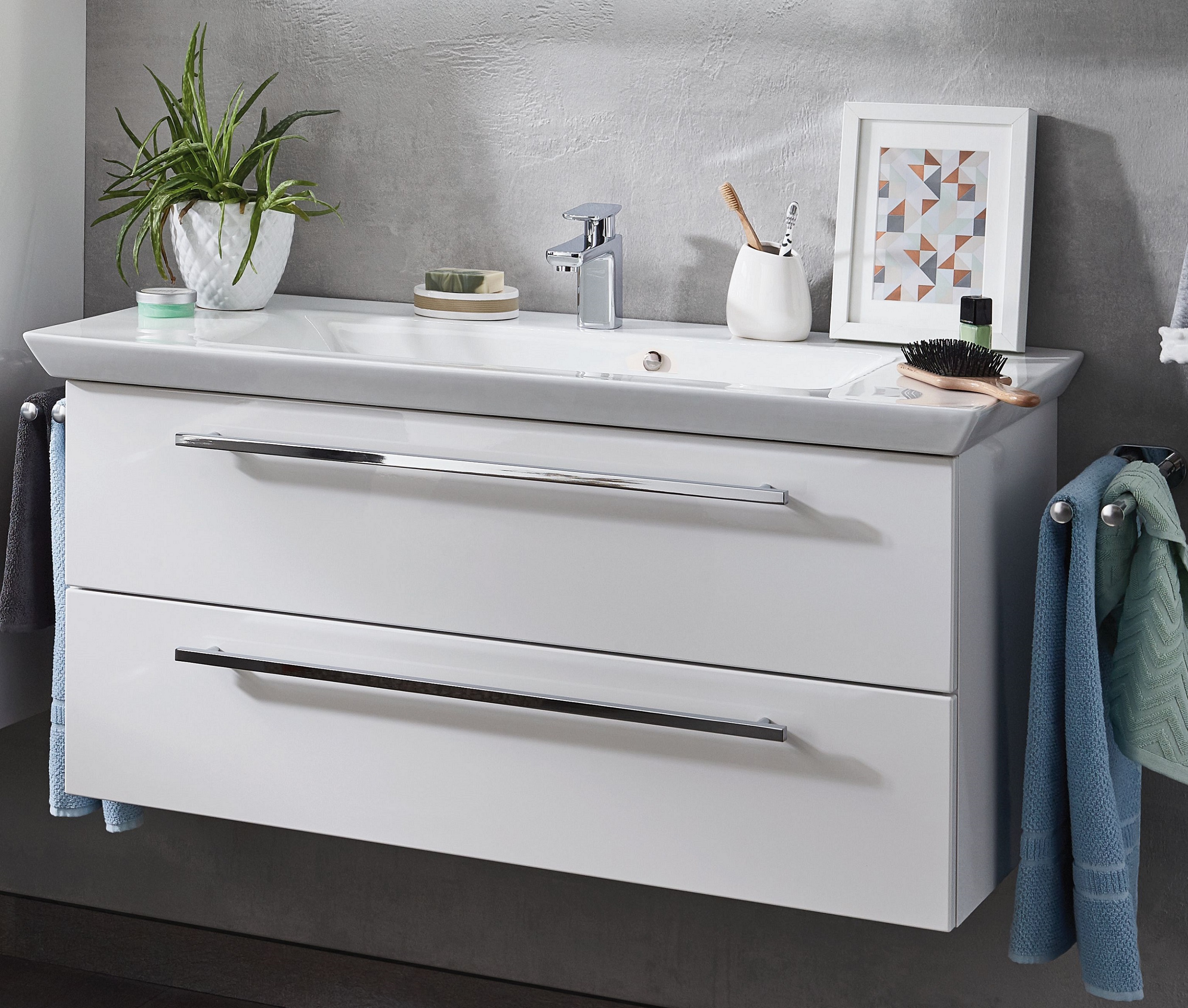 HINWEIS: Abgebildete Dekorationsartikel, Beistellschränke und Armaturen sind im Lieferumfang nicht enthalten und müssen separat bestellt werden.